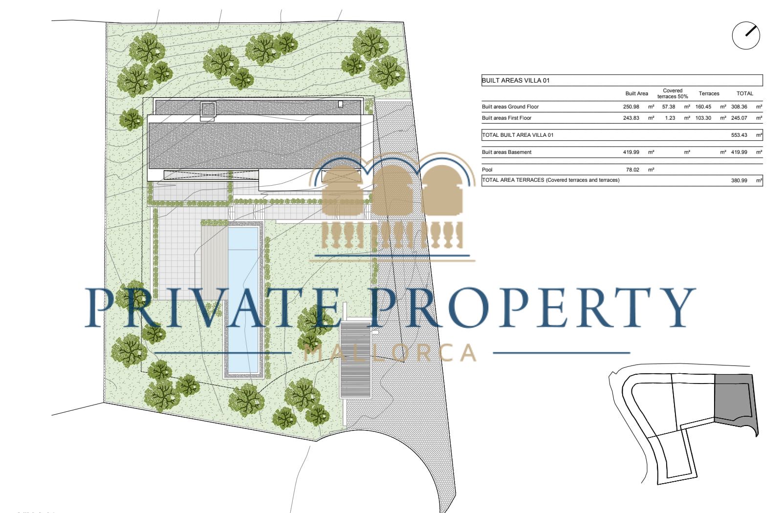An exclusive villa project that meets the highest standards of architecture, design and quality of life is being built on a plot of approx. 2,452 m². The planned villa with a living space of approx. 718 m², spread over three levels, offers you a generous amount of space for individual living dreams.