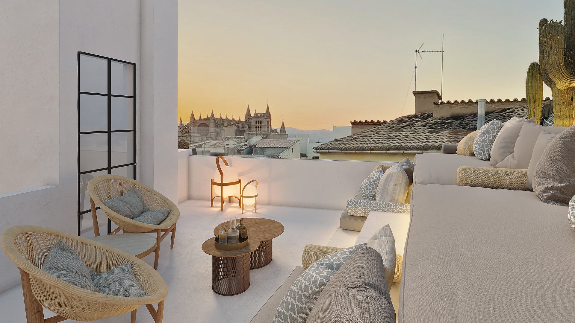 The modern elevator, light-flooded rooms and spacious terraces create an atmosphere that is both luxurious and comfortable. Particularly noteworthy is the idyllic inner courtyard, which is typical of Palma and guarantees peace and privacy.
