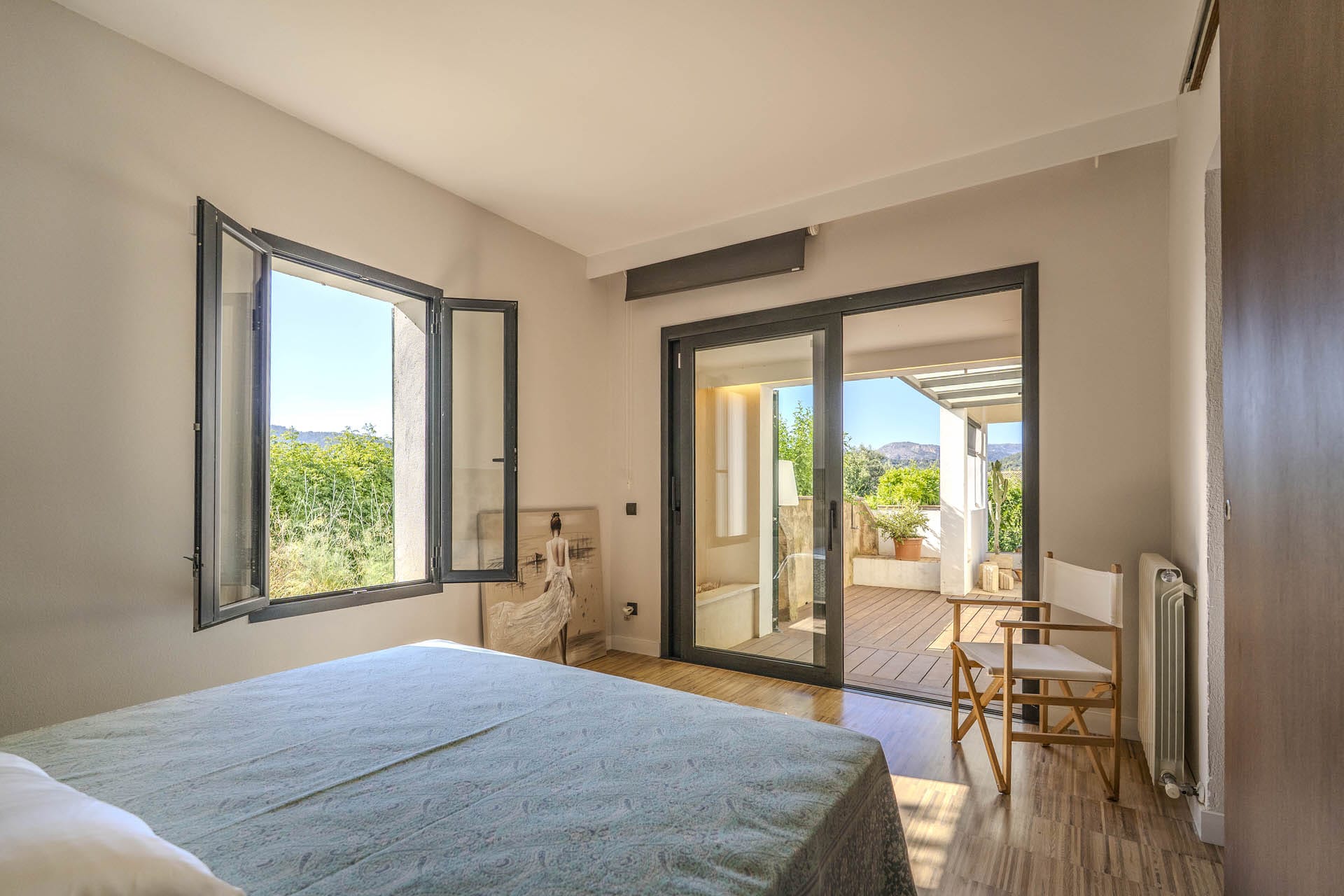 The open, fully equipped kitchen flows seamlessly into a spacious dining area - the perfect place for sociable evenings with family or friends. Adjacent to this, the cozy living area invites you to linger and delights with a fantastic view of the private garden and the majestic mountain backdrop of the Tramuntana. Large windows flood the rooms with natural light and create a warm, inviting atmosphere.