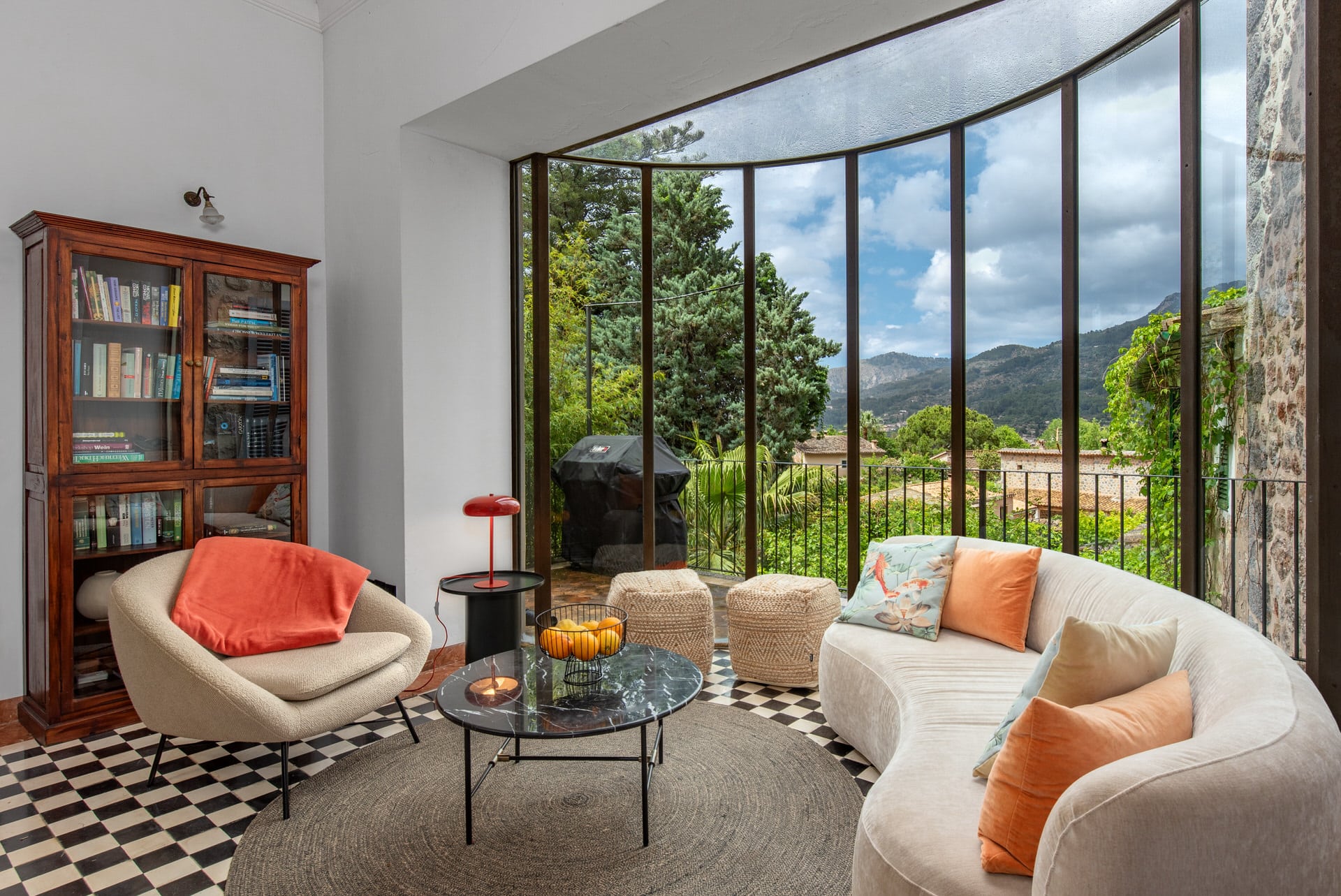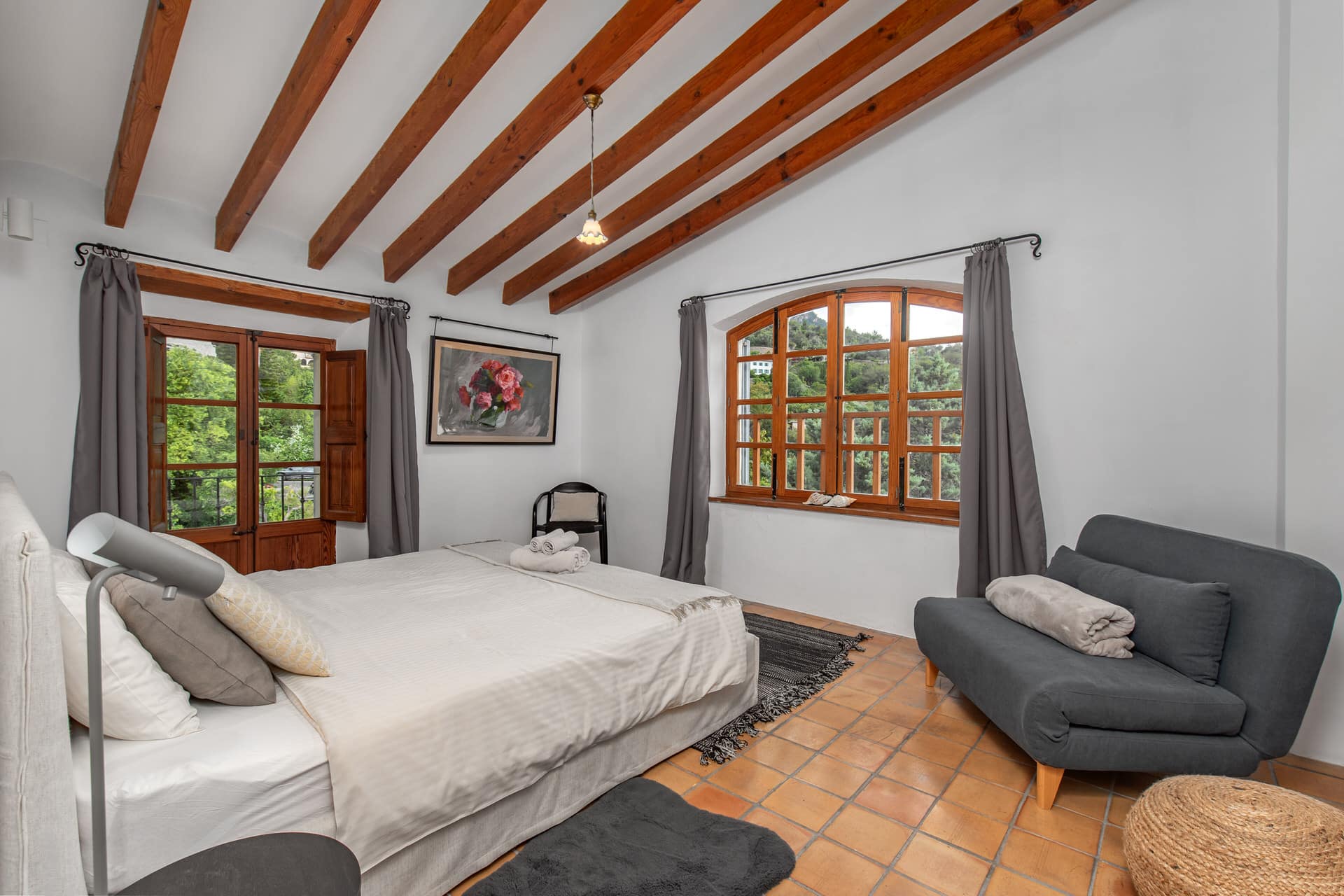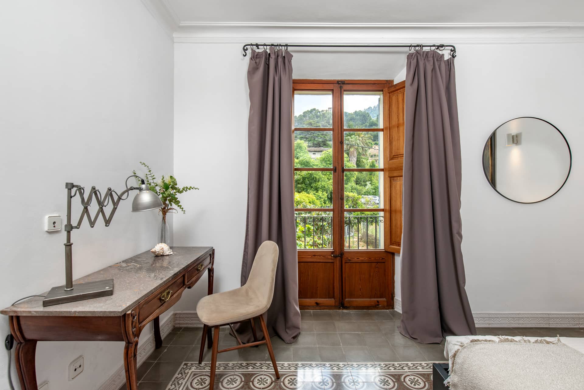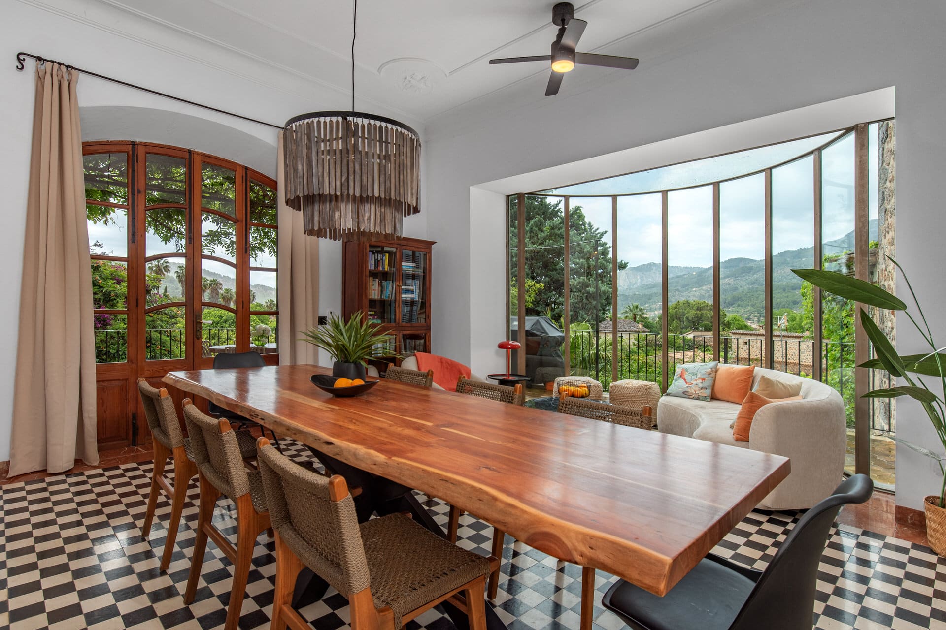 The inviting entrance hall leads you into the kitchen, whose impressive stained glass window offers a picturesque view of the Tramuntana mountains. On the first floor there is also an elegant living/dining room with fireplace and a further living room, both with access to the terrace, from which you can access the garden and pool via a staircase.
