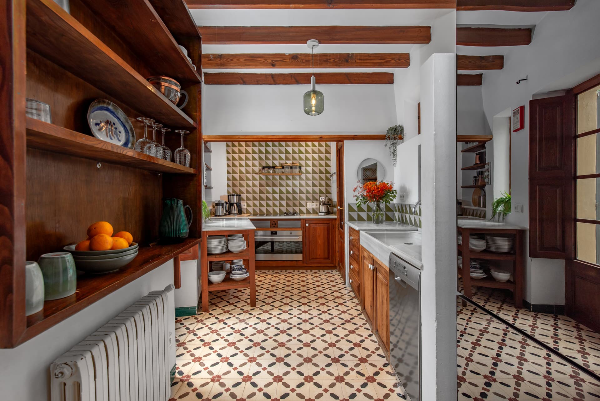 The historic ambience is emphasized by rare and sought-after hydraulic tiles, which give the property a special charm. This classic aesthetic is reflected in the harmonious combination of modern and rustic elements in the furnishings and kitchen.