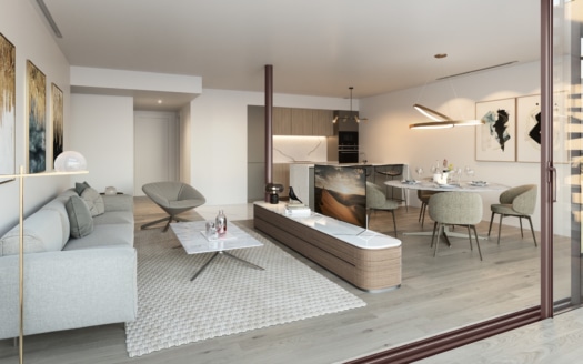 This apartment is located on the 1st floor and features a bright living room with dining area, an open kitchen, and a bedroom with en suite bathroom. From both the living area and the bedroom you have access to the terrace. In the spacious entrance hall of this complex there are two elevators, with which you can reach the apartment, as well as the underground parking. The underground garage extends over two levels and also offers space for bicycles and storage rooms. In addition, there is the possibility to upgrade the basic equipment of the apartment with one of the three individual interior lines (Insula Light, Shine or Glam Style) for an additional charge. A parking space, as well as an additional storage room can be acquired optionally to this property.