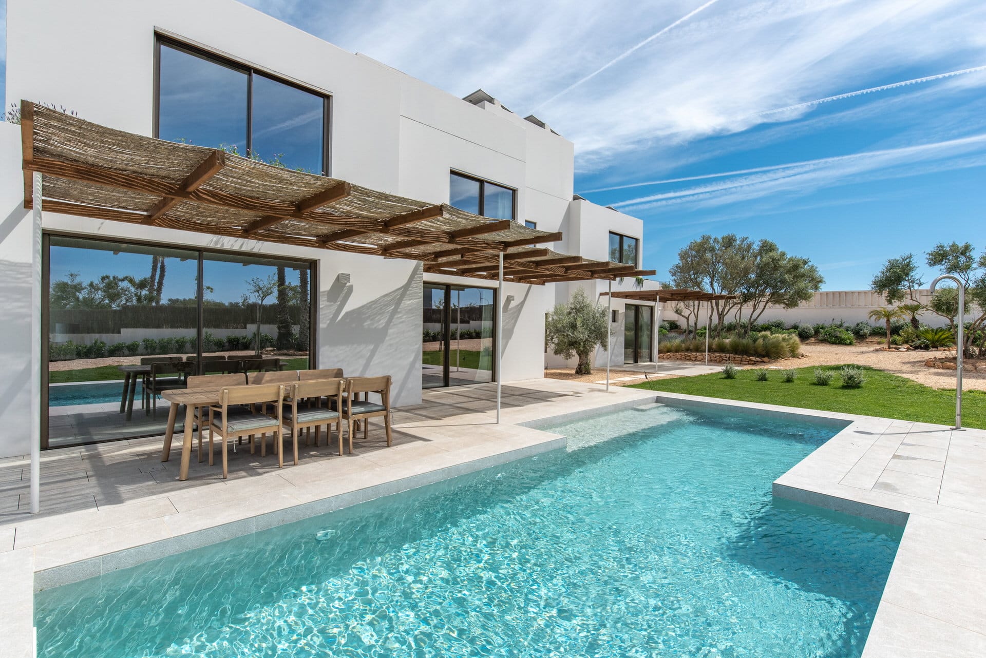 The villa has a total area of approx. 396 m² and offers a well thought-out room concept: on the first floor there is the entrance area, the open-plan living and dining area with kitchen as well as a bedroom and a bathroom. On the upper floor, there are three further bedrooms and two bathrooms, including an en suite bathroom, as well as access to the roof terrace. The basement offers versatile rooms that can be used as a fitness area, home cinema or guest area, for example, as well as a utility room, technical rooms and a garage for two vehicles.