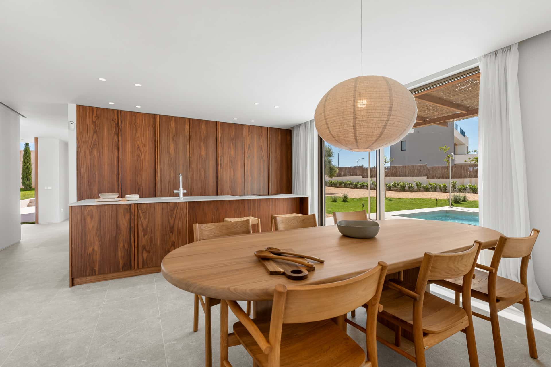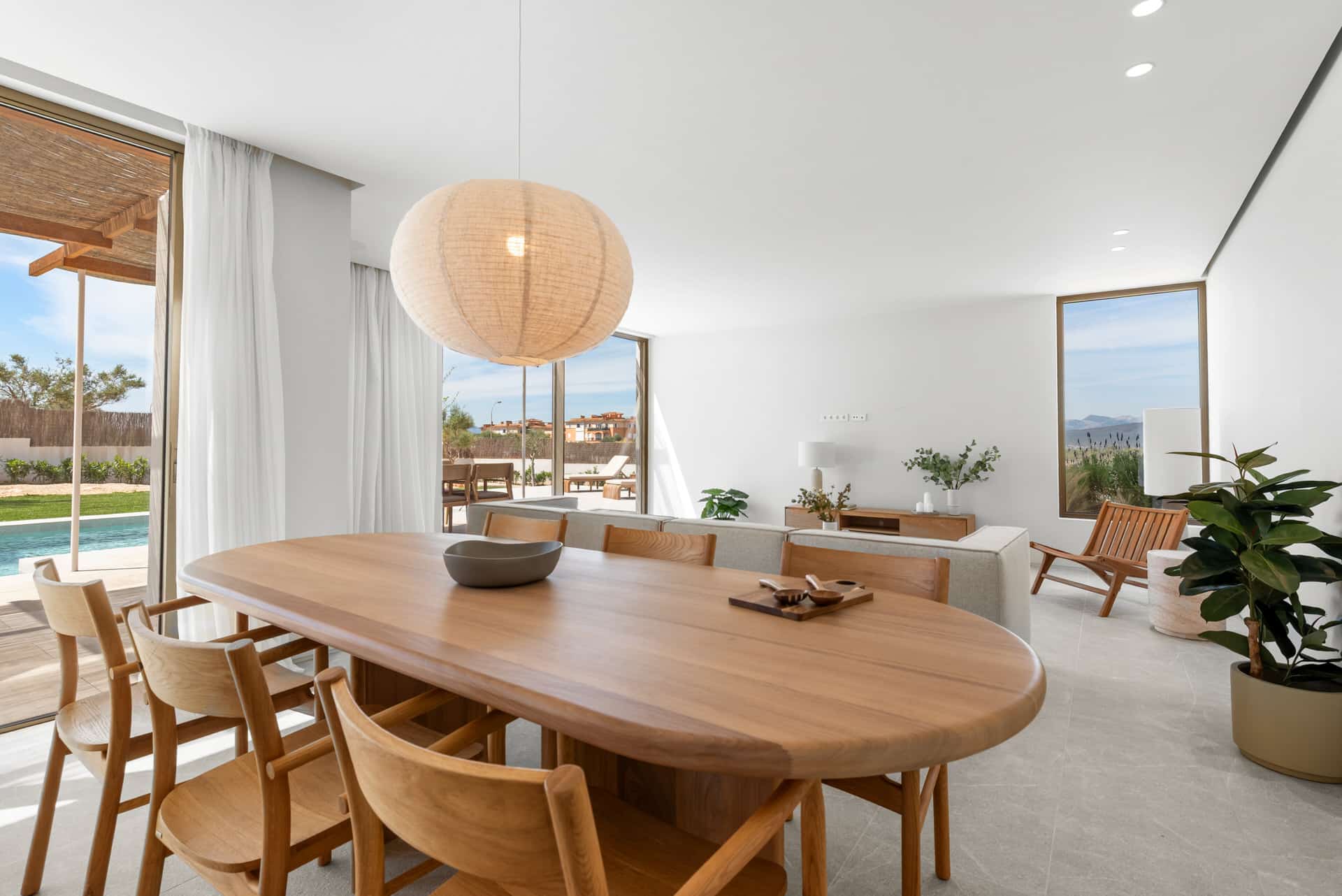 At the heart of the house is the spacious living and dining area with integrated, high-quality equipped kitchen, which flows seamlessly into the outdoor areas through large window fronts. The spacious, south-west-facing terraces offer ideal conditions for enjoying the Mallorcan sun, while the approximately 10-meter-long pool invites you to relax. A particular highlight is the spacious roof terrace, which offers impressive panoramic views over the countryside as far as Palma and the sea.