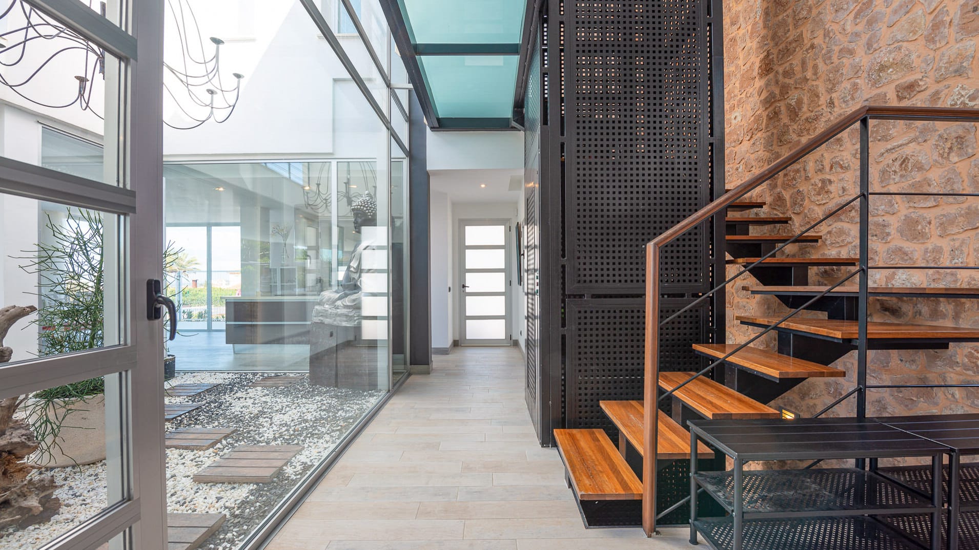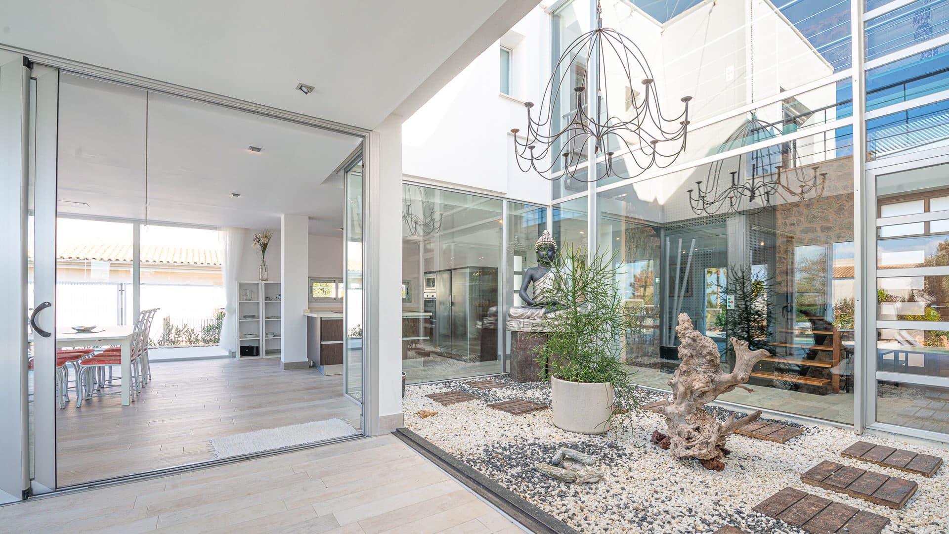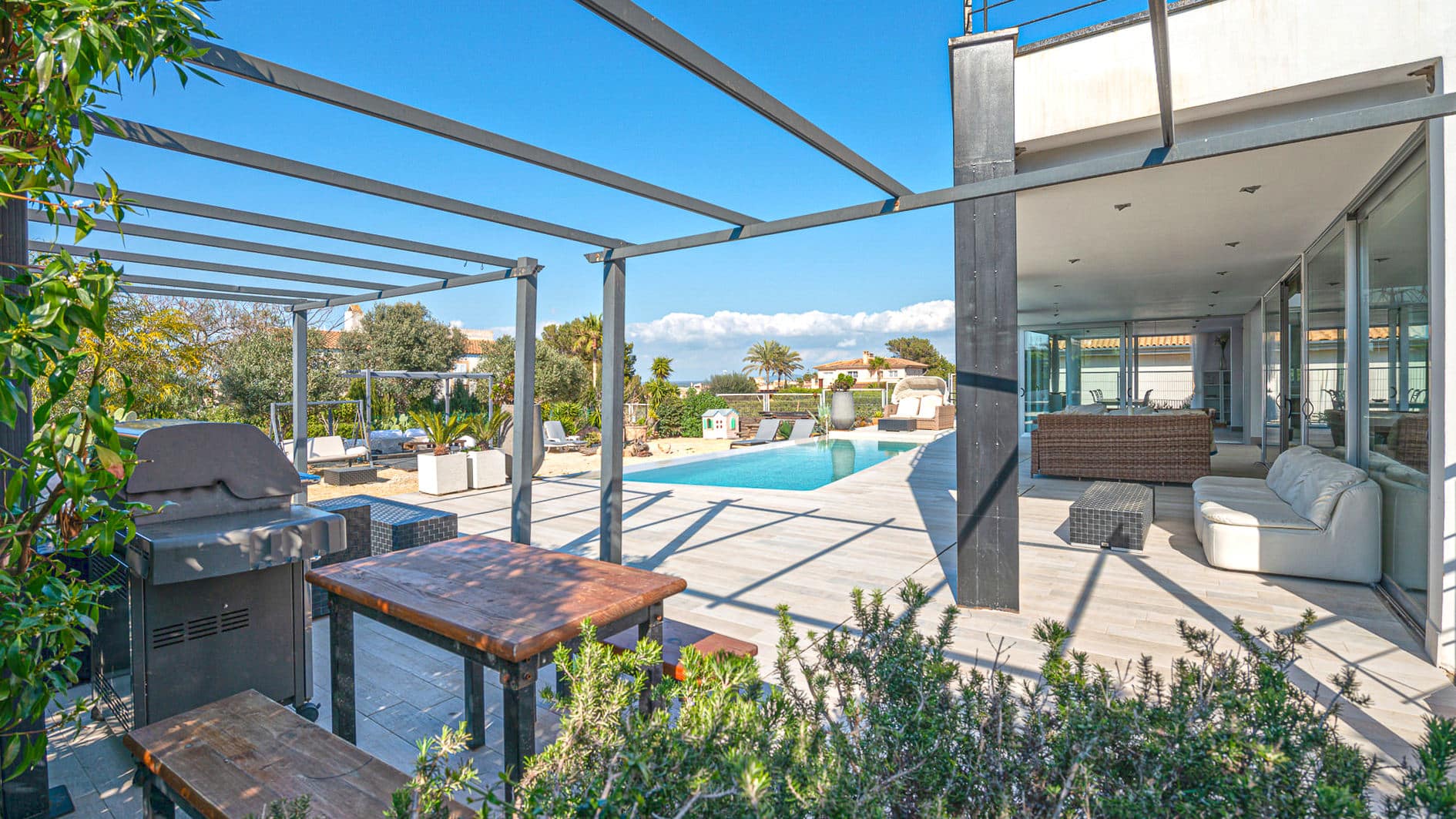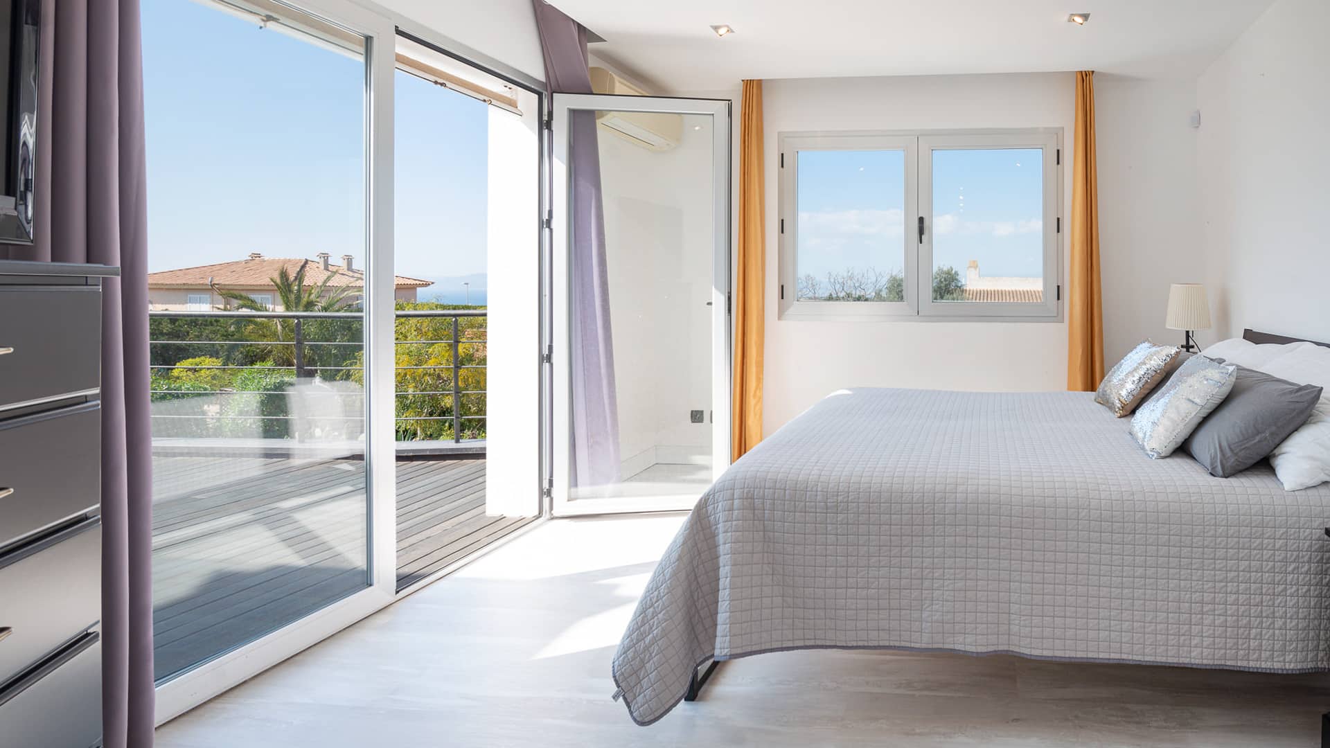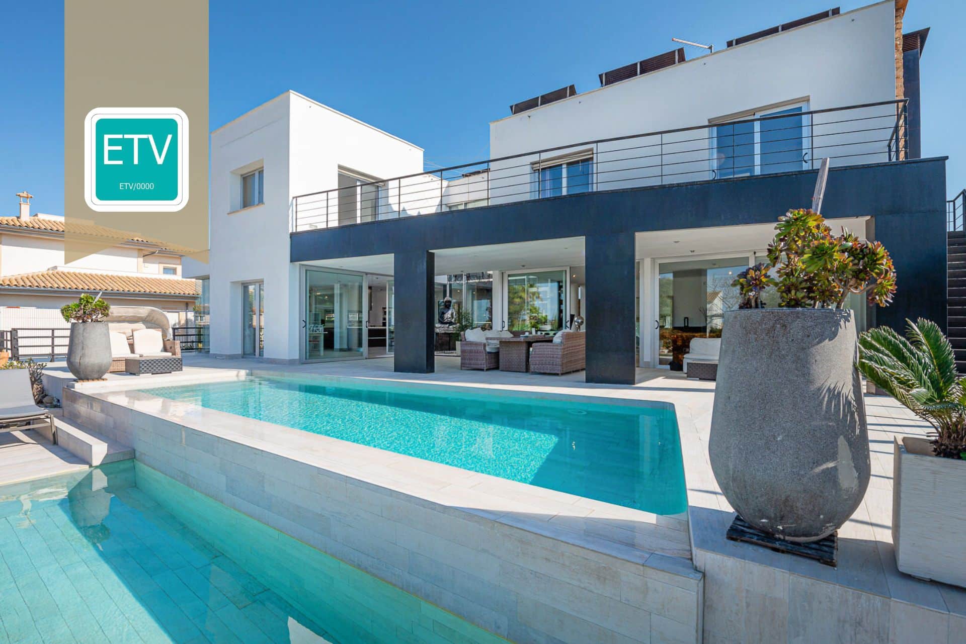 This villa with holiday rental license is located in a quiet and very popular residential area just 20 minutes from Palma. The 530 m² villa with sea views is located on a plot of over 1000 m² and offers beautiful panoramic views. On the ground floor of the villa there is an open plan living room with fireplace and an adjoining kitchen with dining area. Through the glass patio a lot of light enters the rooms and connects the outside with the inside. Furthermore, there is a bedroom and a bathroom on this floor. Over the stairs or comfortably with the elevator in the entrance area you reach the upper floor. Here you will find the master bedroom with bathroom en suite with dressing room, as well as 2 further bedrooms and an additional bathroom. All bedrooms have access to the large terrace with stunning sea views to the bay of Palma.