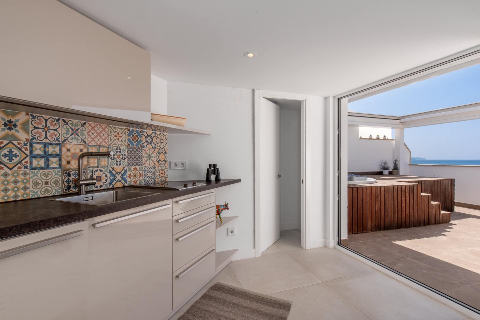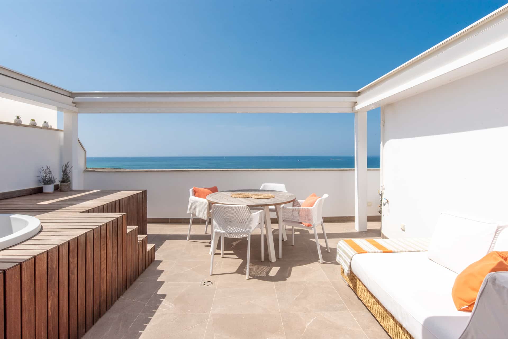The crowning glory: the private roof terrace with an area of approx. 22 m² and a whirlpool - a place to relax, enjoy and marvel, with sun all day long and fantastic views of the sea and the surrounding area.