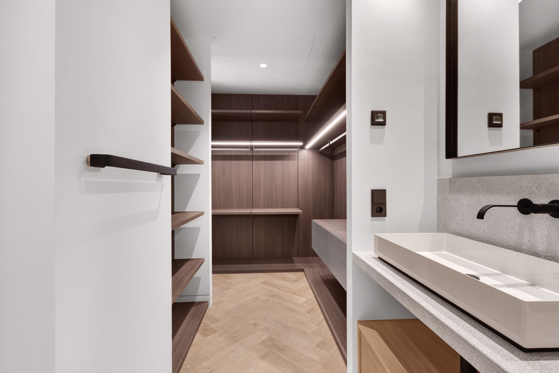 Below the roof terrace is the spacious guest suite with bathroom and walk-in closet. The suite also offers a small lounge with sofa and make-up area for the ladies. The elegant walk-in closet (Made in Italy) is also sure to impress. A further guest room with en-suite bathroom is also located on this floor.