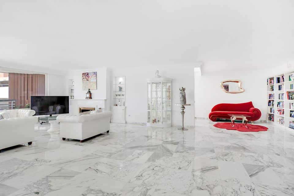 El salón principal de unos 100 m² con chimenea y la amplia terraza soleada son el centro de esta propiedad excepcional. Aquí se crean momentos inolvidables con la familia y los amigos, acompañados de luz, espacio y vistas al mar. Los finos suelos de mármol de todo el ático confieren a las habitaciones una elegancia atemporal y acentúan su carácter lujoso.