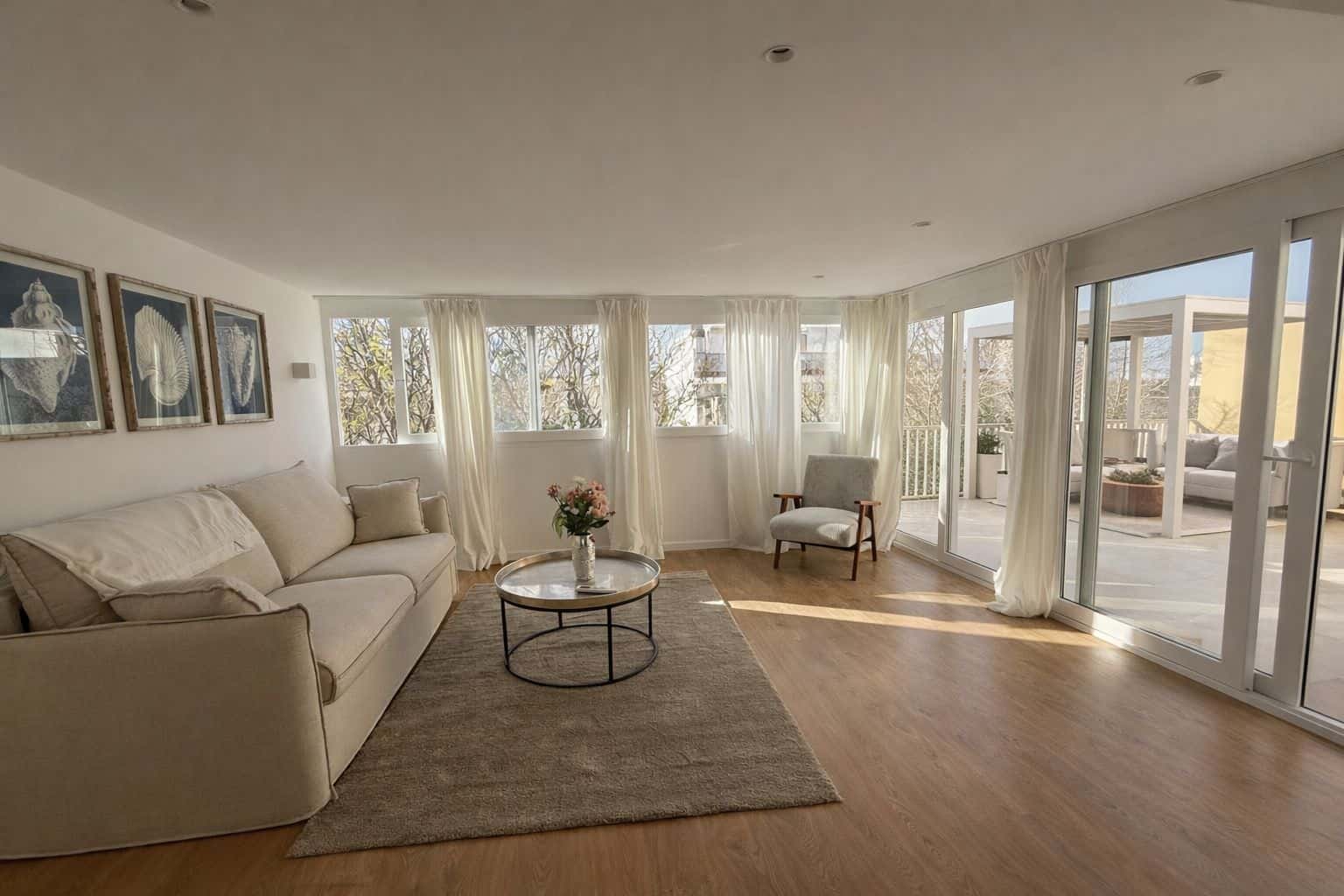 El salón-comedor es la pieza central del piso e impresiona por su amplitud, su diseño diáfano y su conexión directa con las terrazas de la azotea. La cocina amueblada de alta calidad está equipada con placa de inducción, nevera grande y electrodomésticos modernos. Un práctico armario en la cocina alberga el sistema de tratamiento de agua y una conexión para la lavadora; alternativamente, también se puede conectar una lavadora en el cuarto de baño.