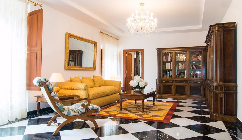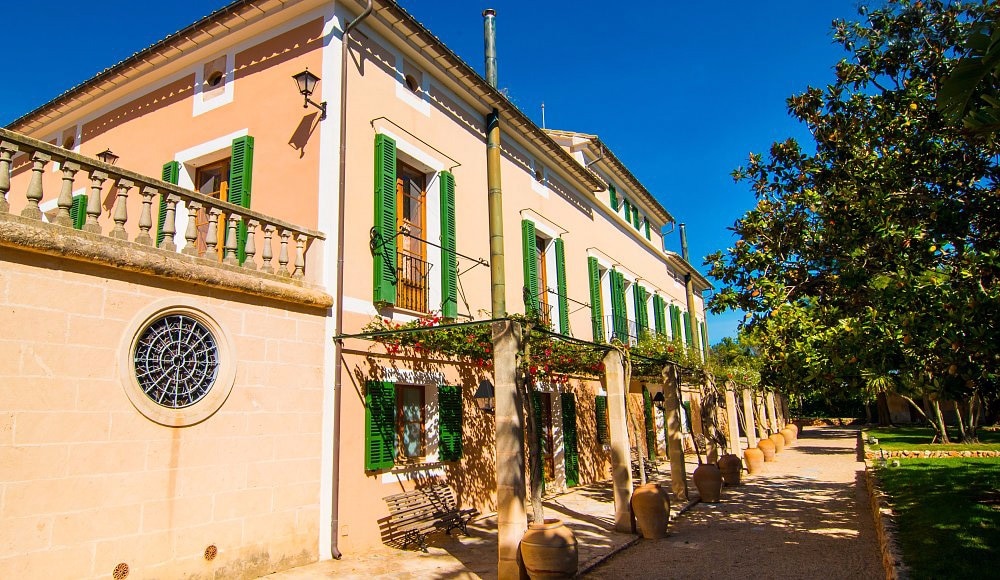 No es de extrañar que el interior sea como la primera aparición de la casa, con un mobiliario feudal y distinguido. El edificio refleja el encanto de una antigua finca mallorquina y al mismo tiempo es una garantía de la más alta calidad de vida en una superficie construida de unos 1.780 m² gracias al uso de los mejores materiales de construcción. Todo aquí es decididamente elegante y coherente. Grandes habitaciones con techos altos, amuebladas con muebles pesados y muy acogedores, lámparas de araña bajo los techos decorados con vigas de madera, así como ventanas de doble hoja que dan al balcón, caracterizan la zona de estar. Los elegantes muebles de madera y las alfombras de alta calidad se encuentran sobre los suelos de piedra de mármol en forma de damero. La cocina contrasta con éxito con la nobleza de las zonas de estar: una cocina blanca supermoderna de alto brillo con todas las comodidades imaginables, como un microondas, un horno a la altura de la barriga, un gran frigorífico-congelador, varias placas de cocción, lavavajillas, cafetera Nespresso y mucho más hacen brillar la estancia. En el centro se encuentra una elegante mesa de comedor con sillas blancas; en el resto de la zona de estar hay otros hermosos comedores. El mobiliario de la cocina tiene un carácter muy urbano, pero subraya de forma especial el contraste entre tradición y modernidad y nos acompaña desde el castillo de cuento hasta el tiempo real. Nueve acogedoras habitaciones, algunas con camas supletorias y camas para niños, cuentan con un total de ocho baños en suite (el noveno dormitorio tiene un WC en suite), que deleitan con variaciones de color individuales en blanco, azul, marrón, amarillo brillante y algo de nostalgia. Los azulejos están decorados con delicados motivos de tradición mallorquina. Si alguna vez hay grupos más grandes en esta propiedad, dos aseos para invitados completan las instalaciones sanitarias. Los radiadores y el sistema de aire acondicionado frío/calor hacen que sea fácil vivir en esta casa durante todo el año, y una chimenea contribuye a crear un ambiente acogedor en los meses más fríos. En cuanto a la disponibilidad de medios, aquí se puede disfrutar de buenas instalaciones: desde la televisión con conexión por satélite hasta el teléfono e Internet WLAN, todo está disponible aquí, y la casa está, por supuesto, conectada a la red eléctrica pública. El suministro de agua proviene de un pozo privado, y el agua se trata con un moderno sistema de filtro de cal.