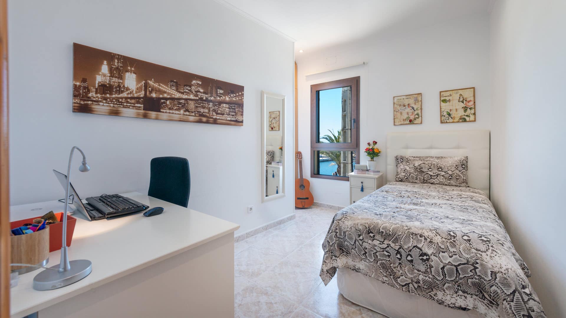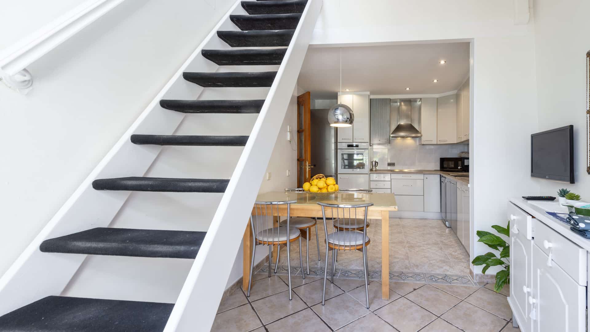 La superficie habitable de aprox. 127 m² se distribuye en dos plantas de la siguiente manera: en la primera planta se encuentra el acogedor salón-comedor y la cocina contigua, abierta y totalmente equipada, un total de tres dormitorios, dos baños y un balcón con vistas al frondoso y tranquilo patio interior. Una escalera conduce a la planta superior, donde hay otra amplia zona de estar y la terraza de aprox. 40 m² con espectaculares vistas al puerto y al mar. Un trastero y un lavadero completan esta propiedad.