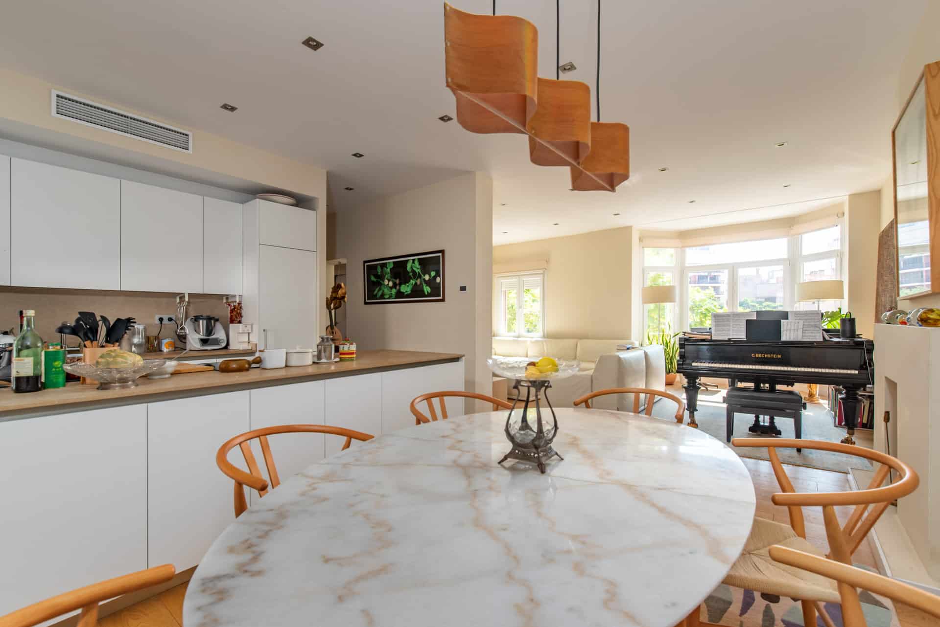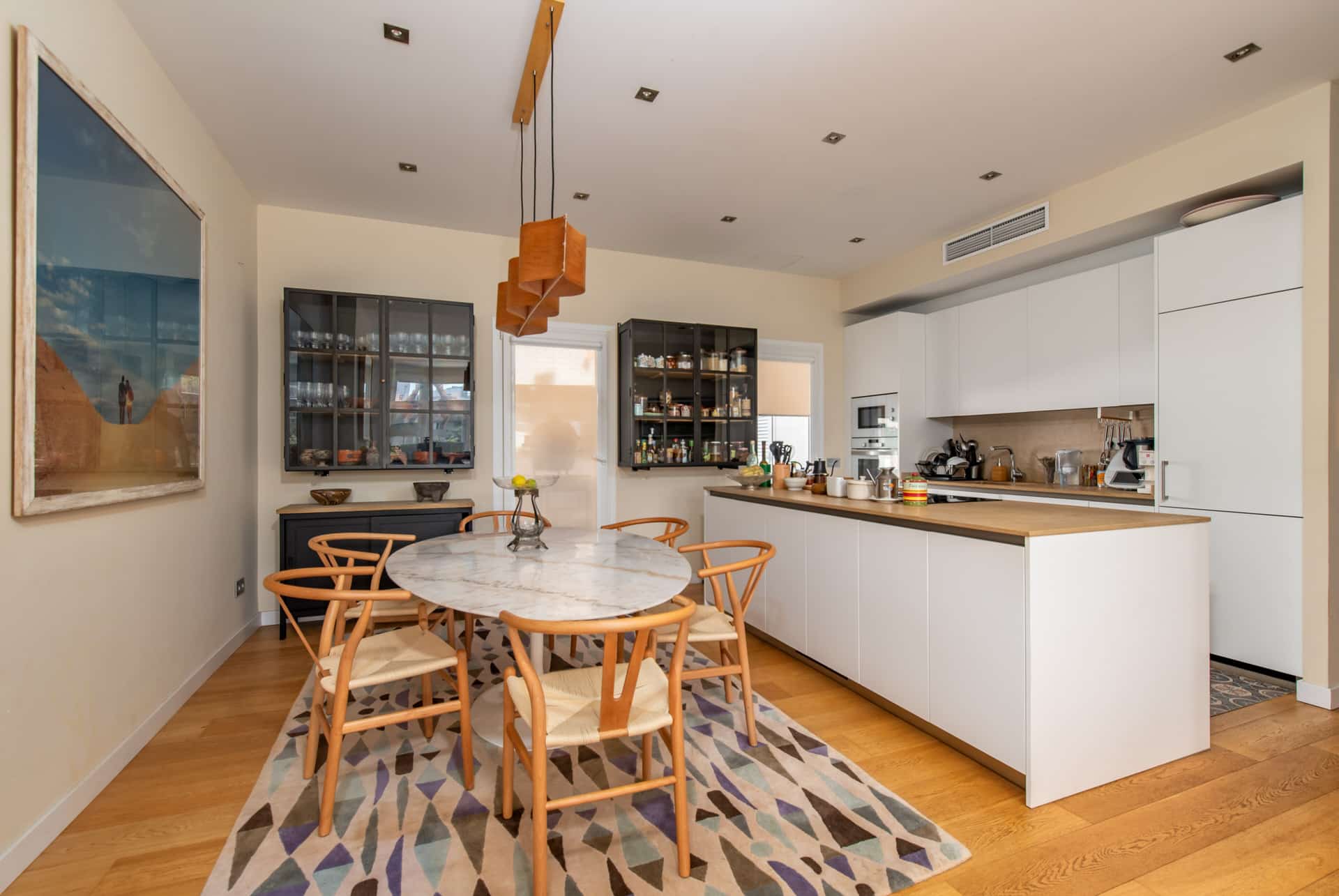 En una superficie habitable de aprox. 140 m² le espera un concepto de espacio bien pensado: el salón-comedor de planta abierta crea una sensación de amplitud y ofrece mucho espacio para vivir y relajarse. La moderna cocina abierta con isla central es un verdadero punto de atracción, ideal para veladas sociales o para el elegante día a día. Gracias a las ventanas bien situadas, todas las habitaciones son agradablemente luminosas y se benefician de mucha luz natural, otro punto a favor de la vida urbana en el centro.