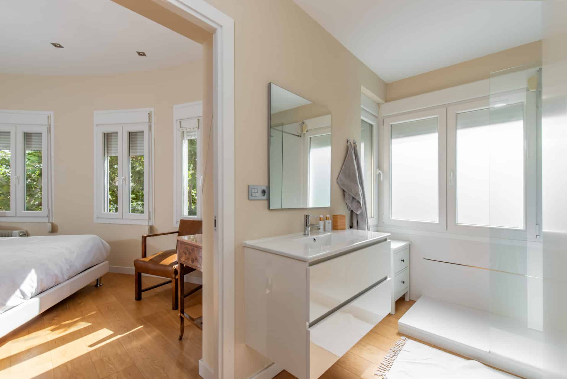 El piso cuenta con tres amplios dormitorios, cada uno con su propio cuarto de baño. También hay un aseo de invitados, perfecto para visitas o para el día a día.