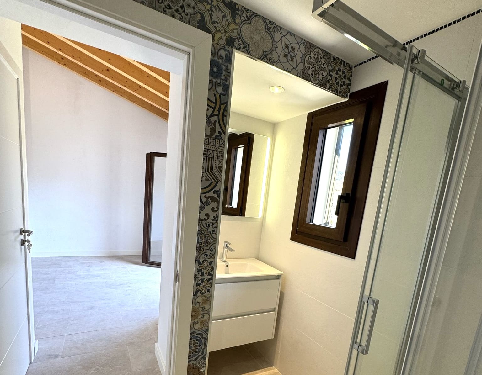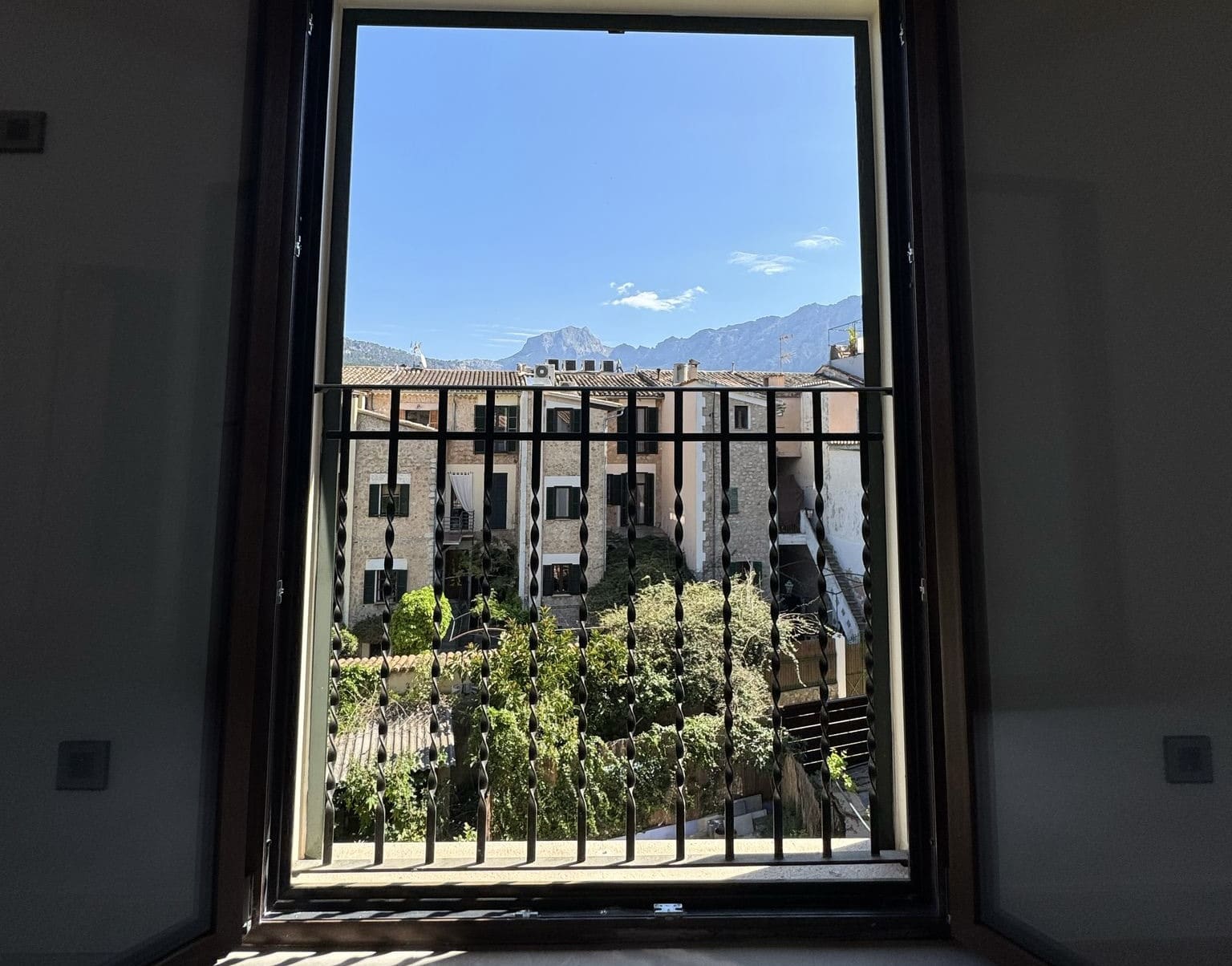 La casa dispone de tres cómodos dormitorios, cada uno con su propio cuarto de baño, que le ofrecen la máxima privacidad. Tanto desde el salón como desde los dormitorios podrá disfrutar de unas inigualables vistas panorámicas de las majestuosas cumbres de la Sierra de Tramuntana, un espectáculo diario de la naturaleza que le encantará.