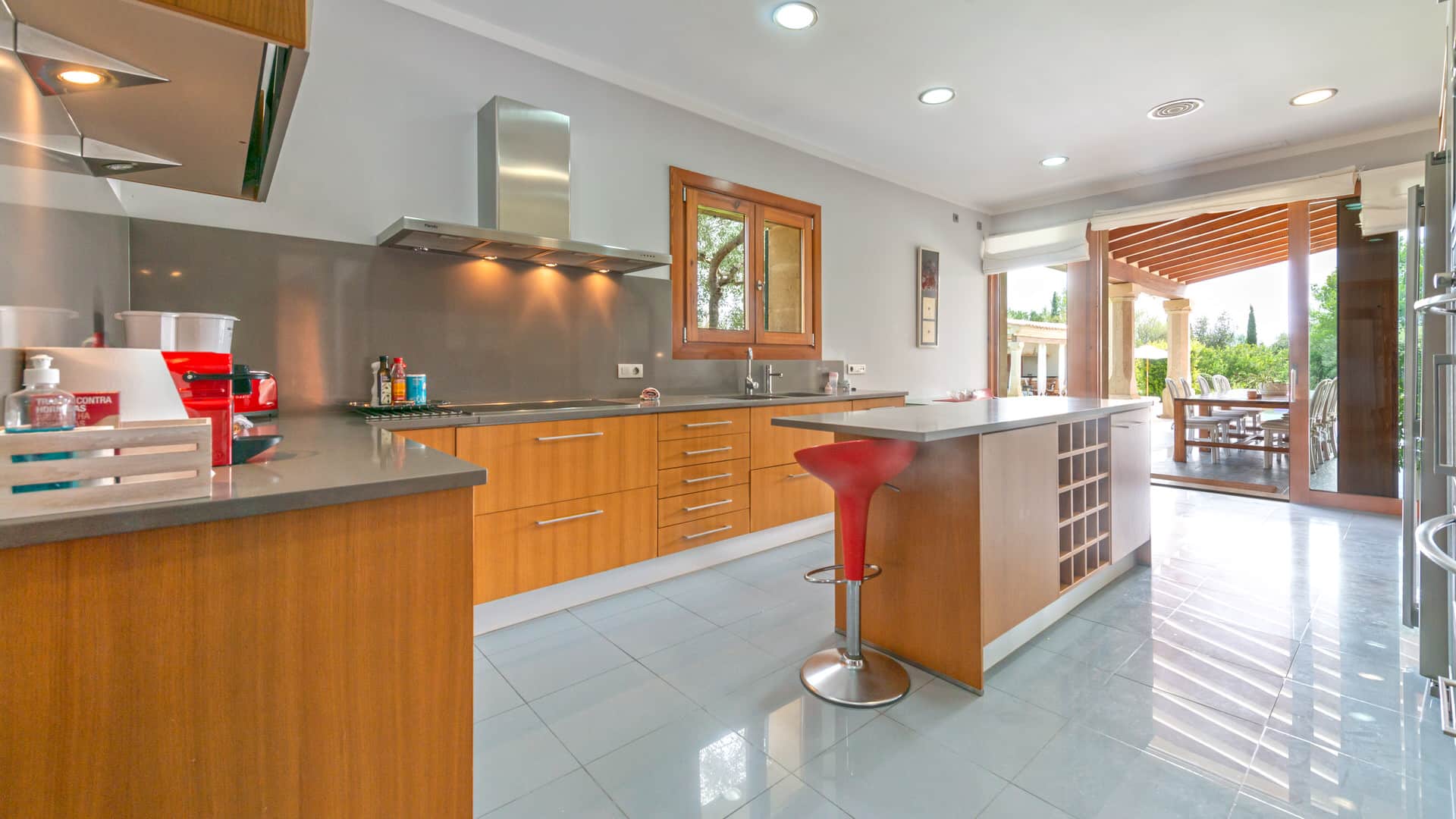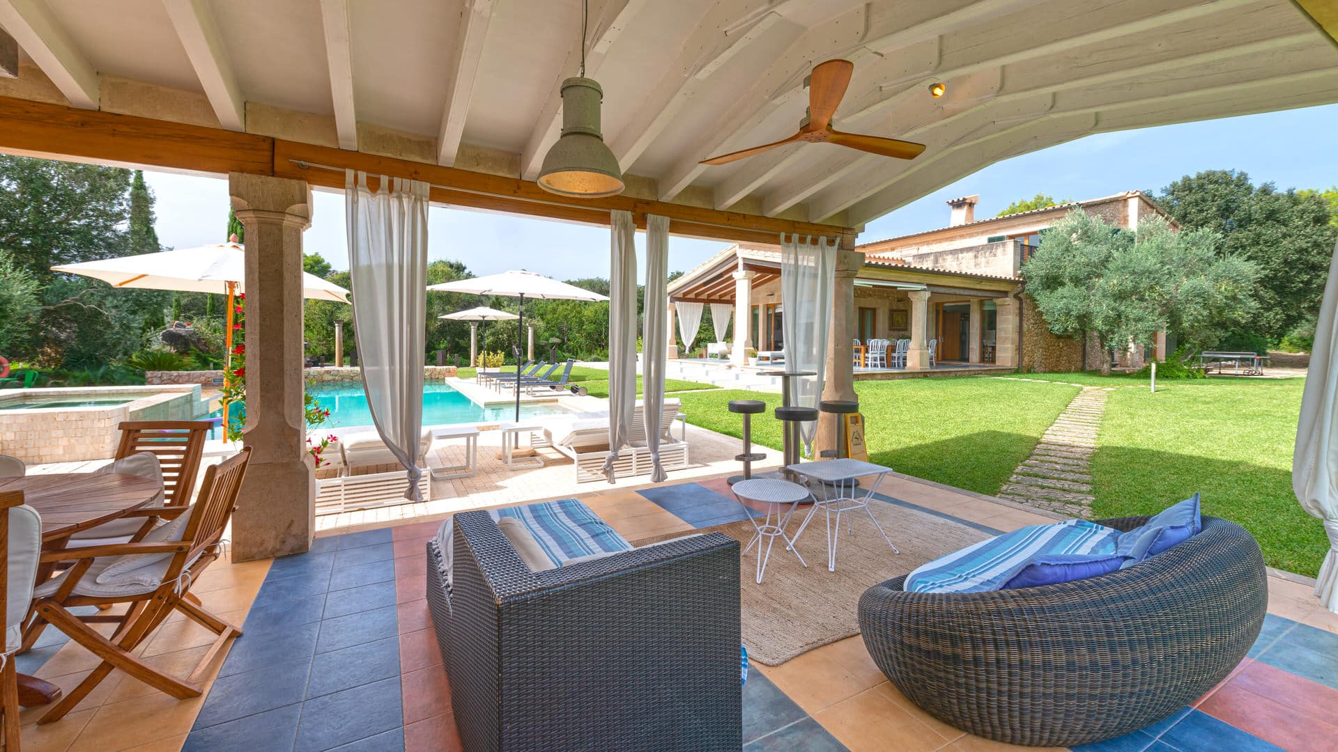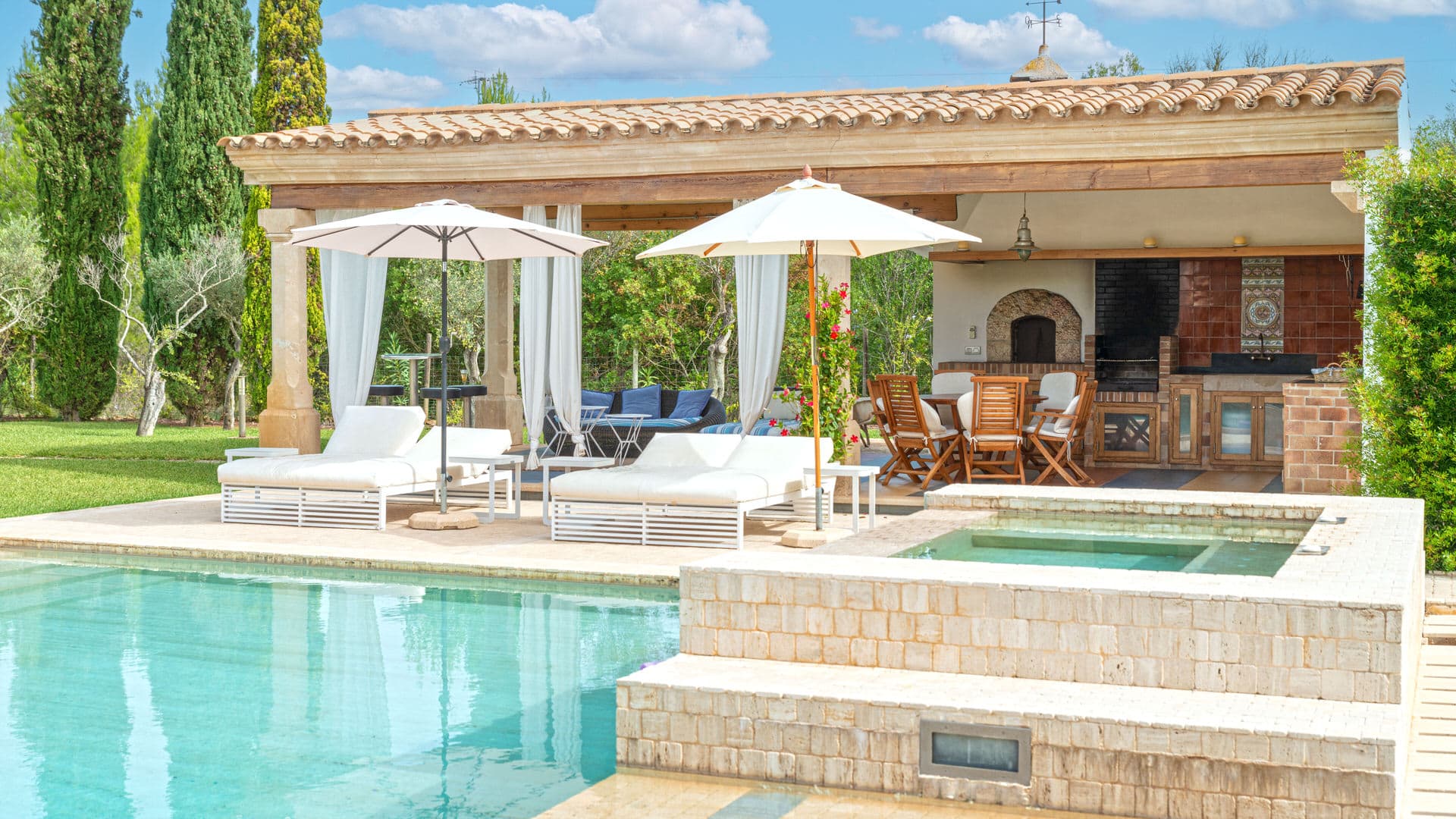 La enorme piscina está enclavada en un maravilloso jardín típico mediterráneo con pérgola contigua con cocina exterior y zona de comedor. Una plaza de aparcamiento para varios vehículos y un jacuzzi completan esta oferta.