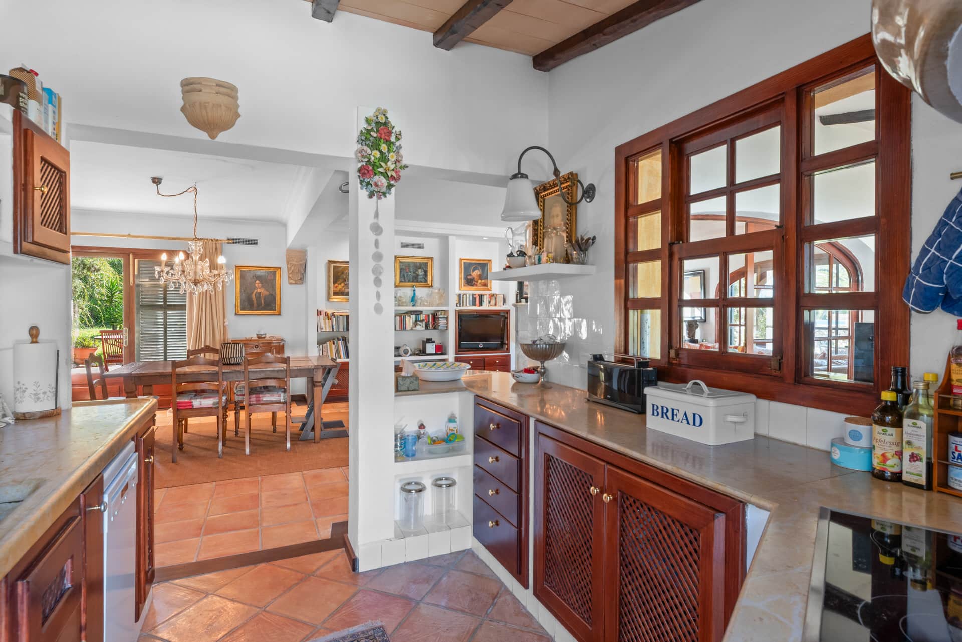 La finca se distribuye en dos plantas y ofrece una amplia zona de estar con una cocina mediterránea abierta, un comedor independiente y otra habitación que puede utilizarse como estudio, por ejemplo.
