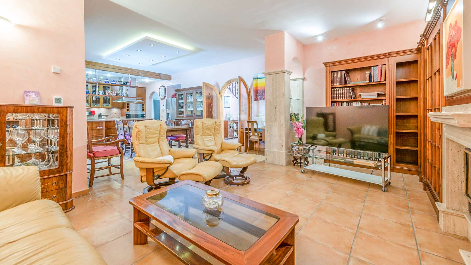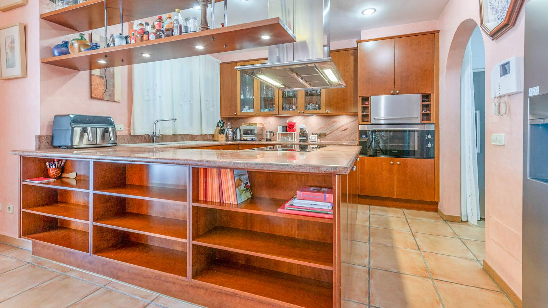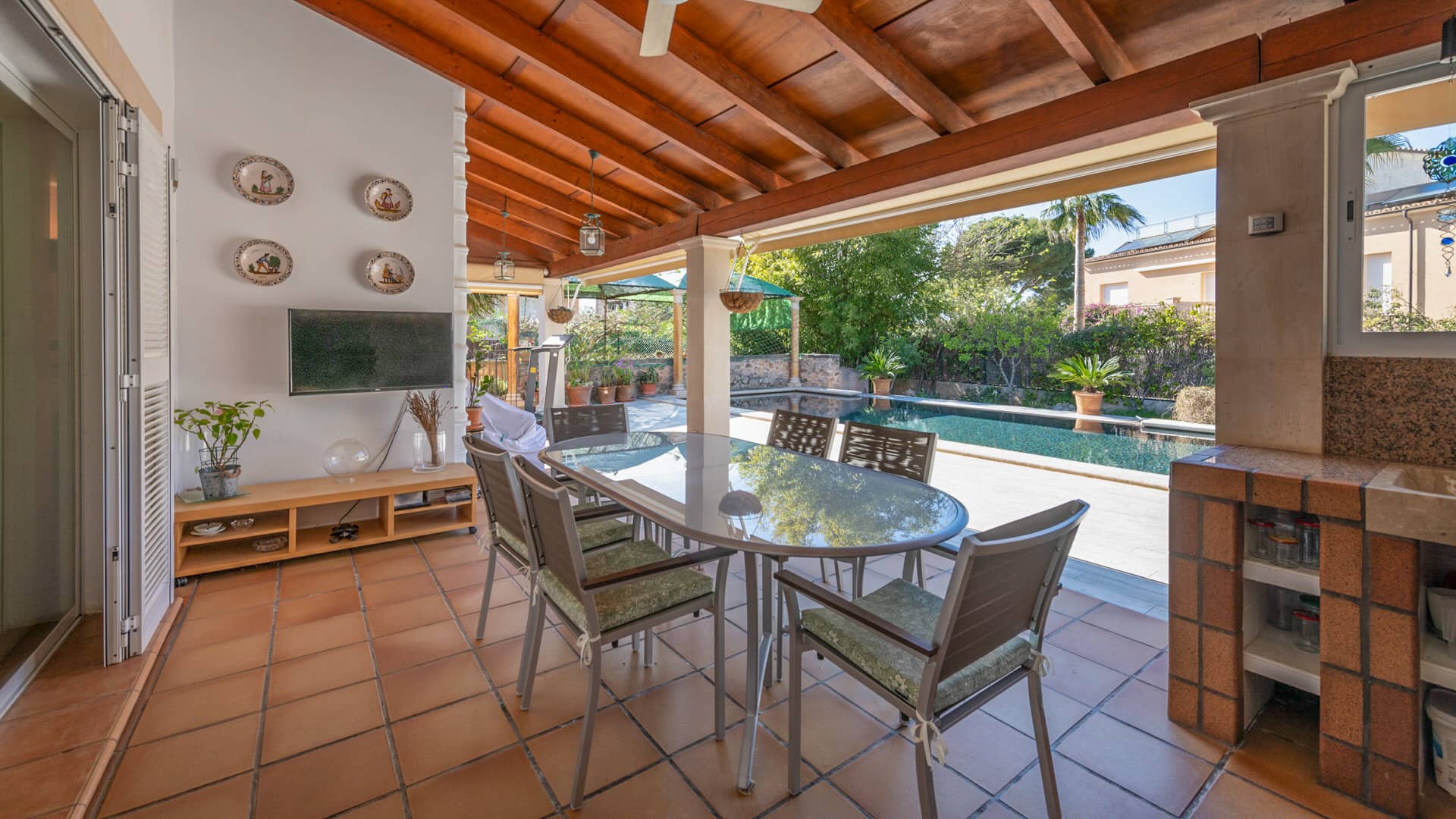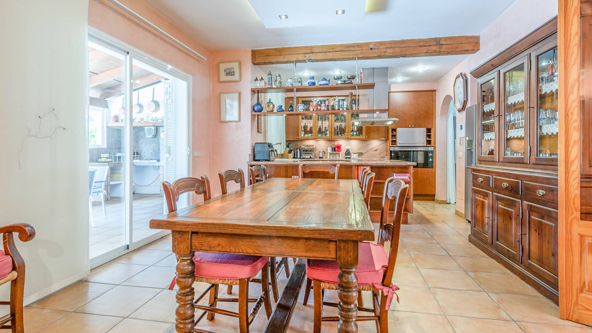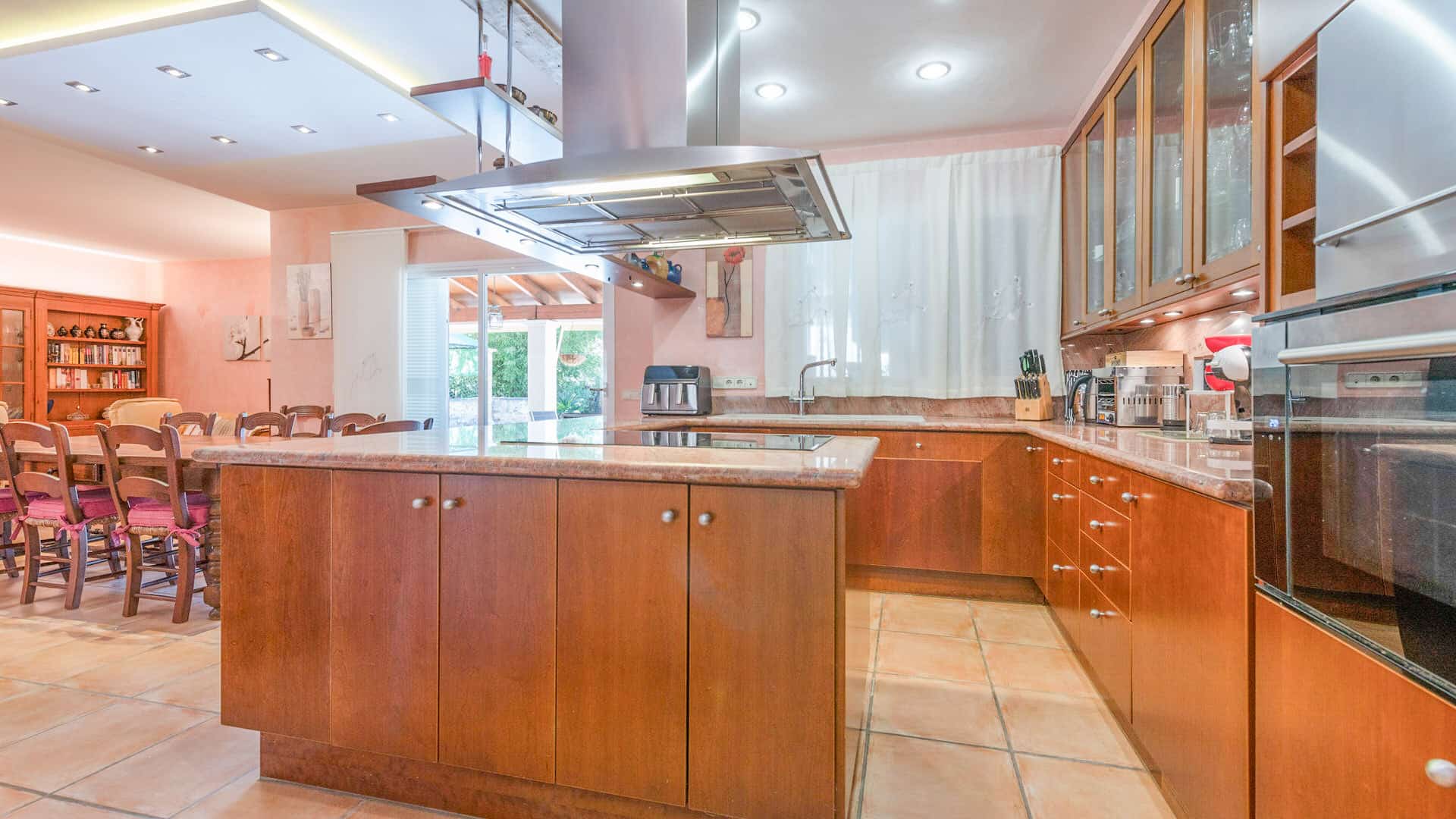 El salón-comedor de planta abierta con cocina integrada y bien equipada constituye el punto de encuentro central de la casa. Desde aquí se accede directamente a la terraza cubierta con zona de barbacoa, perfecta para veladas relajadas o reuniones sociales.