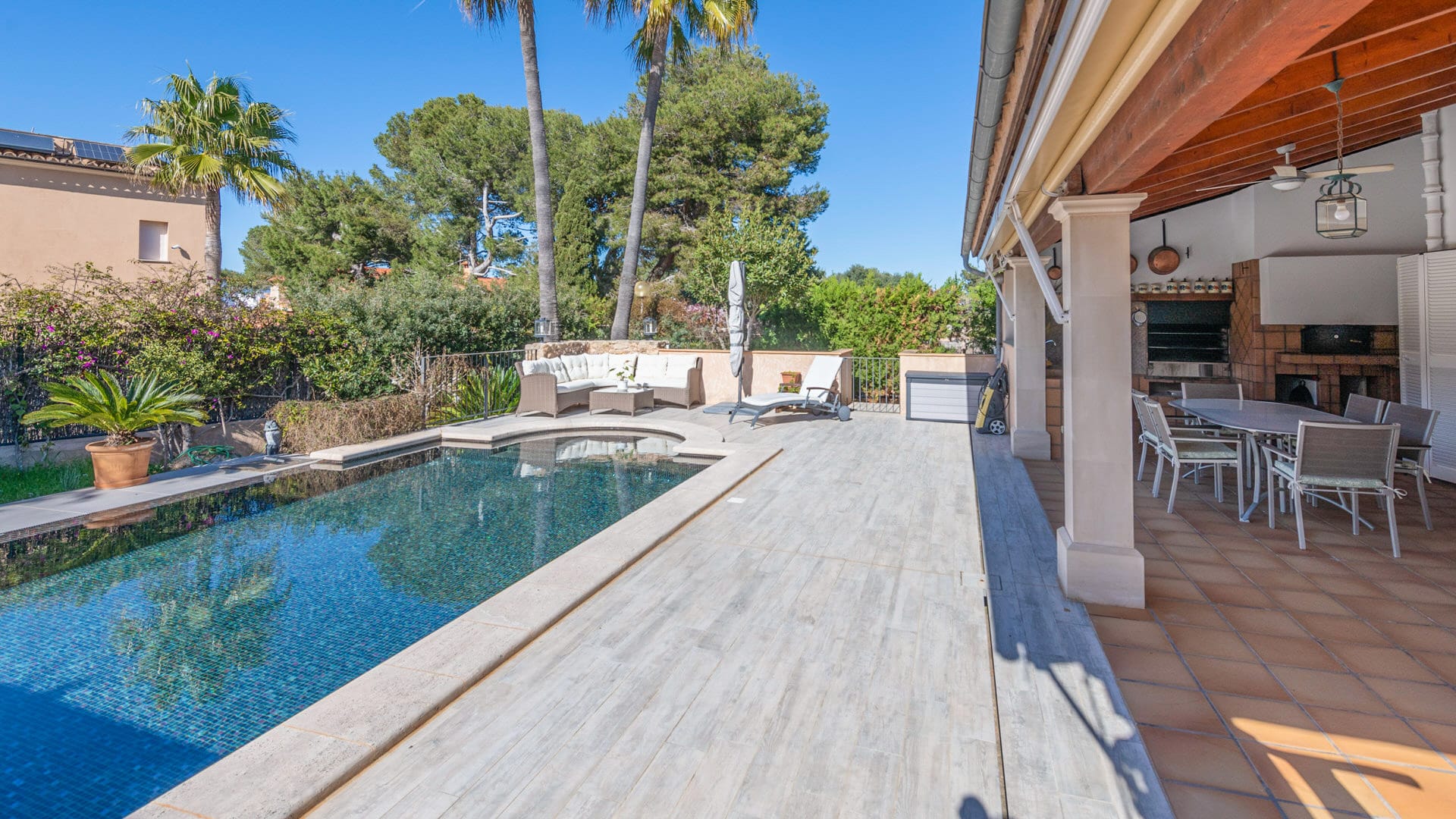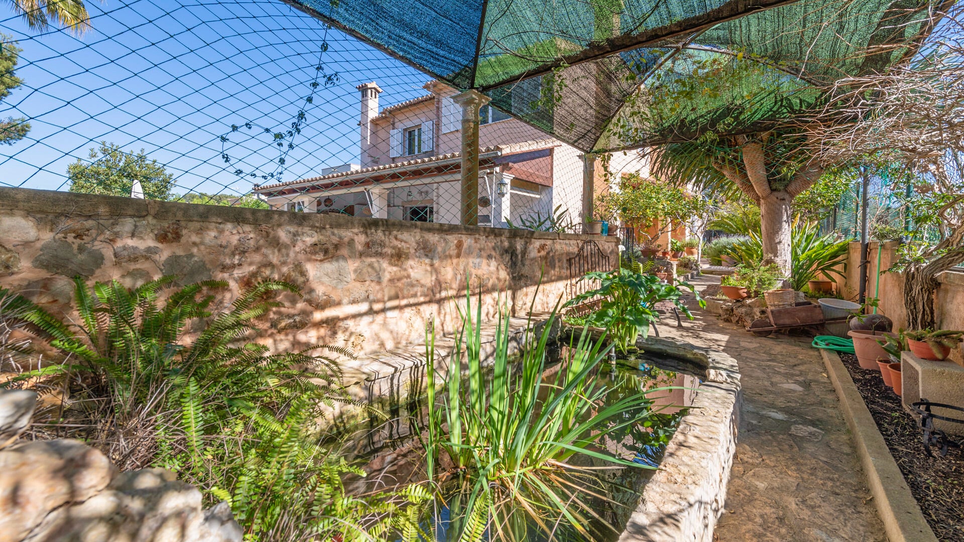 En el exterior, encontrará un cuidado jardín con árboles frutales, un pequeño huerto y un estanque decorativo con peces. La zona de la piscina climatizada con cubierta automática proporciona comodidad adicional y calidad de ocio durante todo el año.