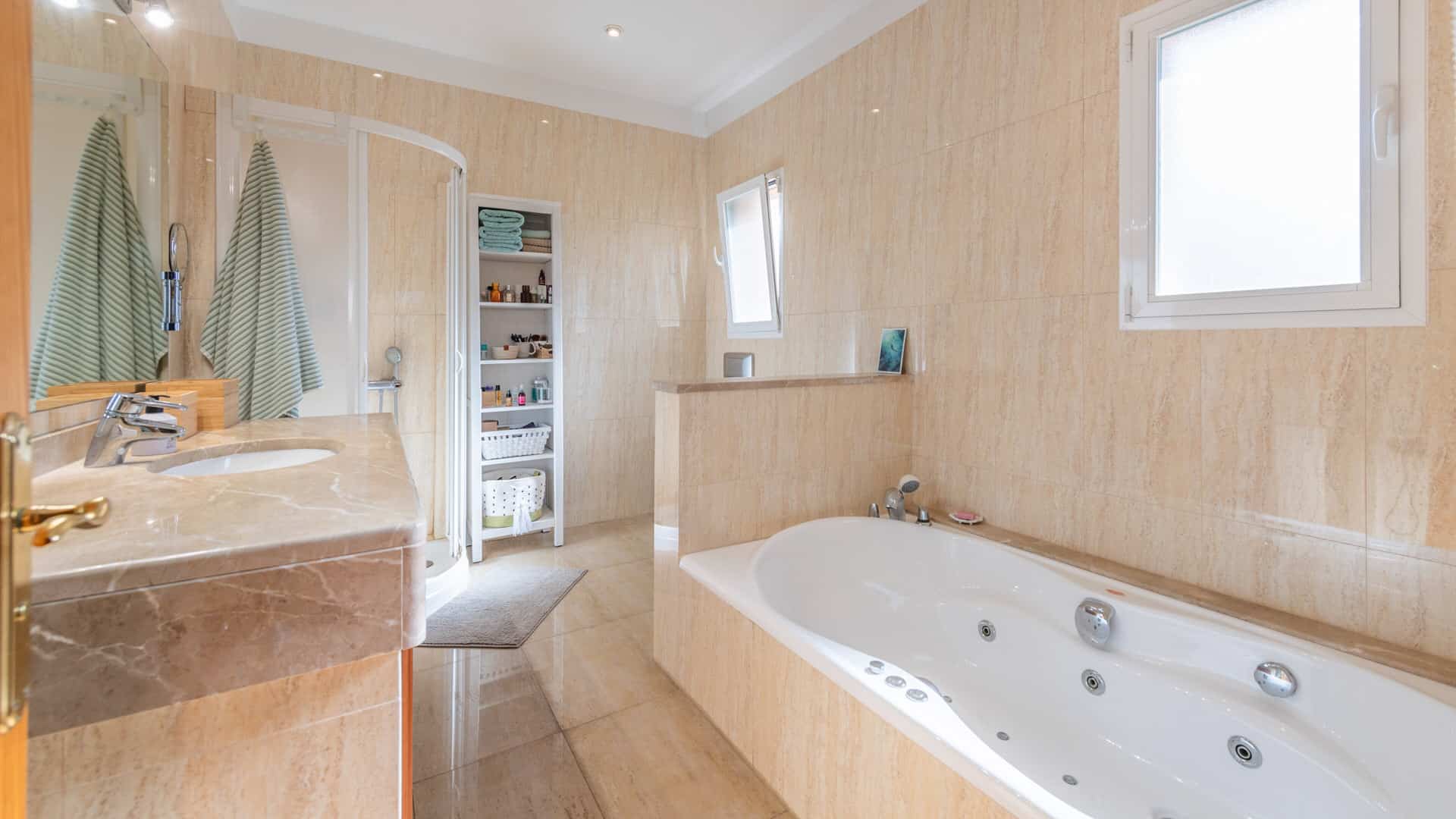 Un total de 5 dormitorios y 5 cuartos de baño, así como un aseo separado, se reparten en unos 307 m² de superficie habitable. Las habitaciones son luminosas y acogedoras, con una distribución que permite tanto la vida en común como el retiro.