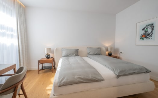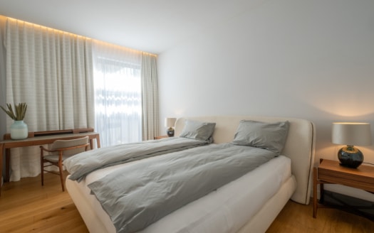 Déjese encantar por la moderna elegancia de este chalet independiente. El amplio salón-comedor con la moderna cocina Bulthaup abierta invita a pasar relajadas veladas con la familia y los amigos. Los suelos de roble confieren a las estancias un ambiente elegante, mientras que la calefacción por suelo radiante garantiza un calor acogedor en los días fríos.