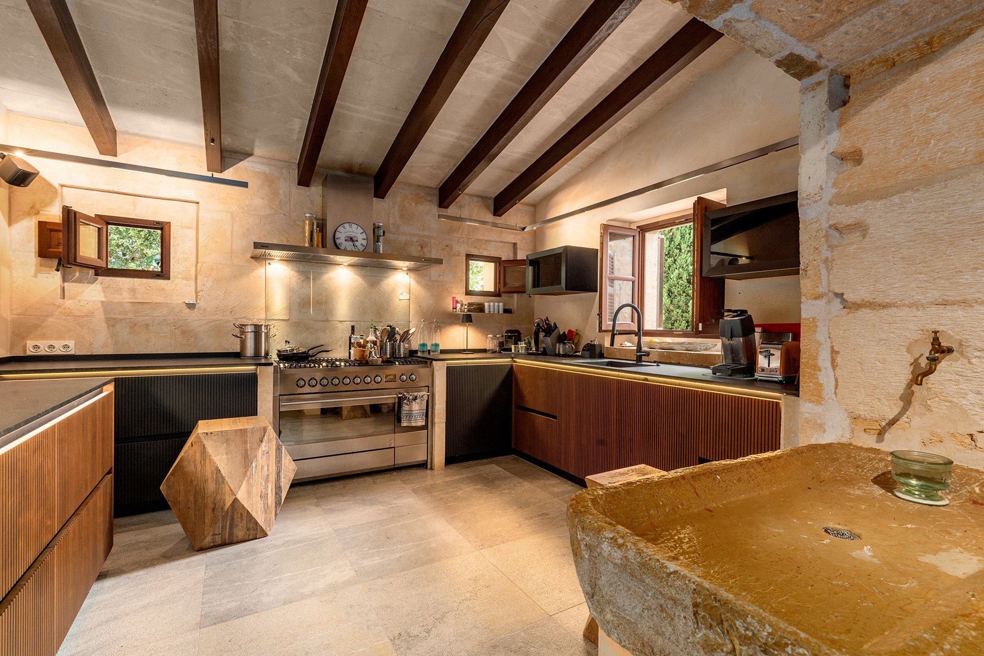 La cocina es especialmente impresionante porque es ultramoderna, adaptada con gusto al estilo de la finca y totalmente equipada con electrodomésticos de marca. Esta cocina no deja nada que desear.