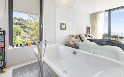 La moderna villa está situada en una zona tranquila de Costa d’en Blanes y ofrece una fantástica vista al mar desde todos los niveles. Los casi 300 m² de superficie habitable se distribuyen en 3 plantas.
