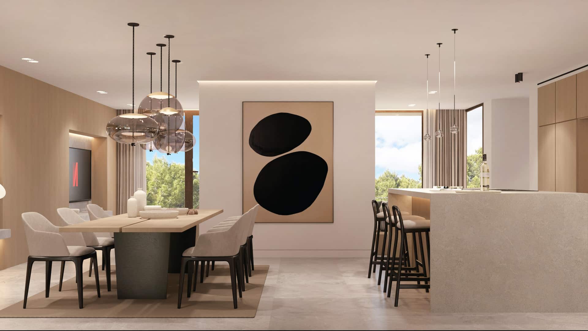 La zona exterior ofrece una amplia piscina rodeada de un jardín mediterráneo, una elegante zona de barbacoa y varias zonas de terraza, perfectas para disfrutar al máximo del clima mallorquín.