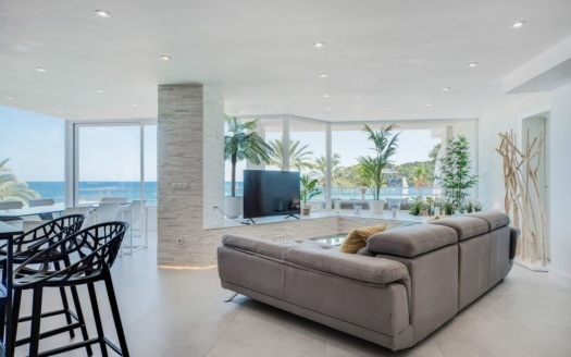 Este lujoso piso de diseño, completamente renovado, está situado en 1ª línea de mar, directamente en la playa de Calviá y ofrece unas fantásticas vistas panorámicas al mar.