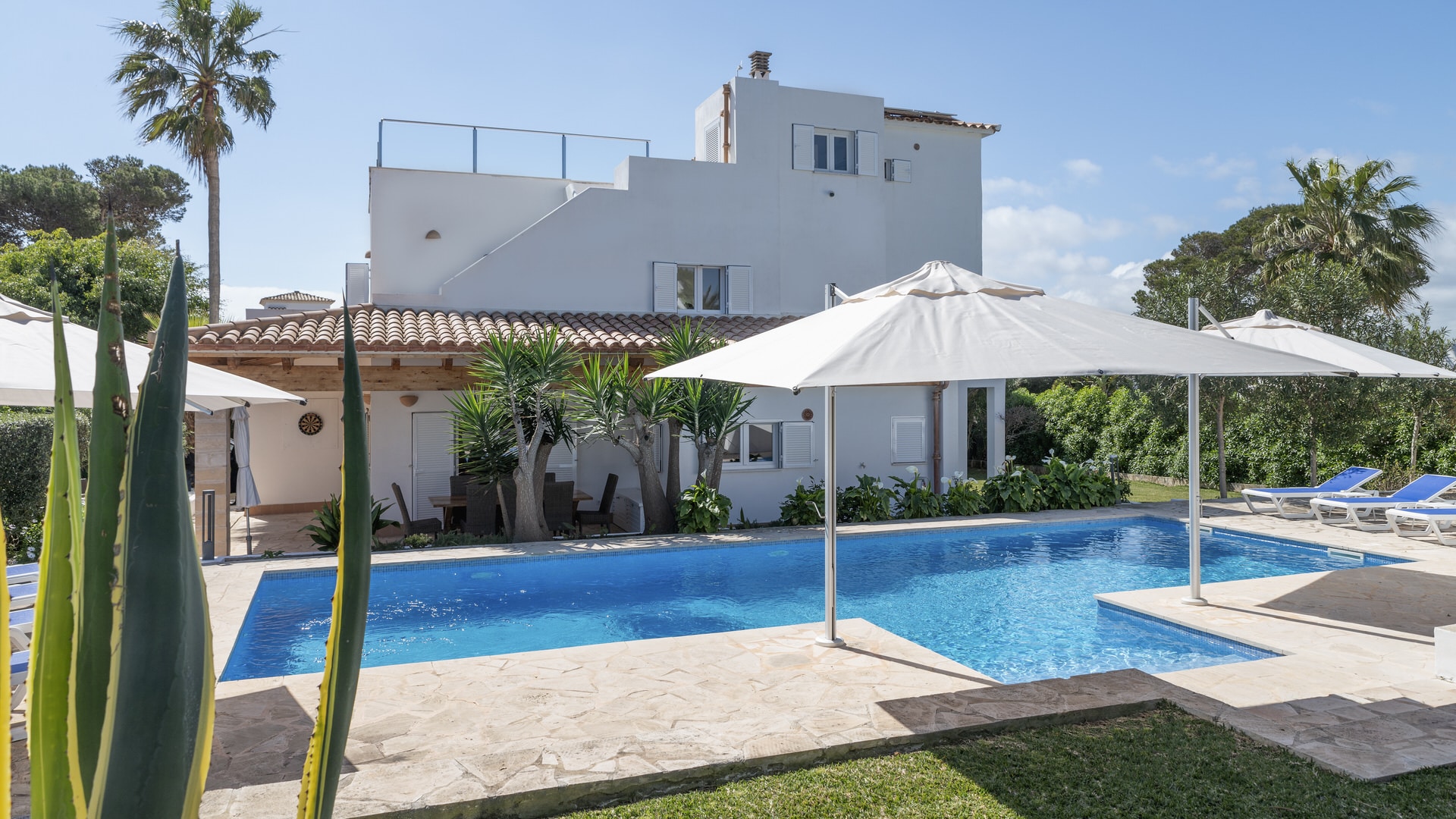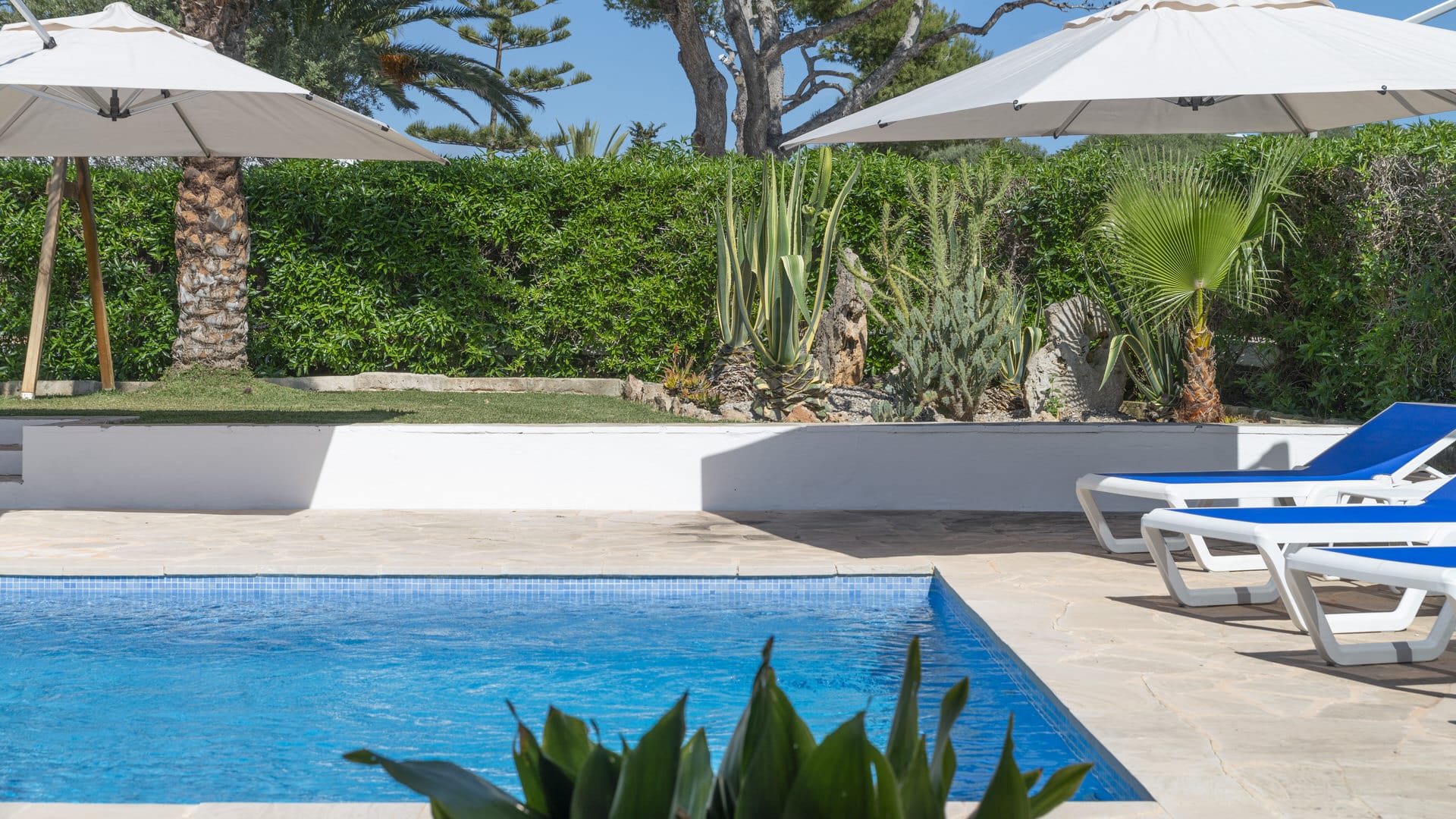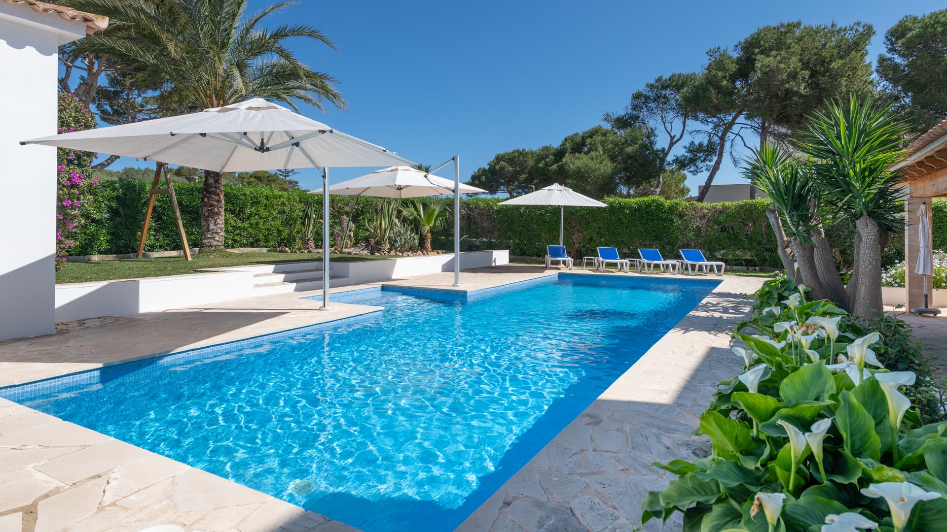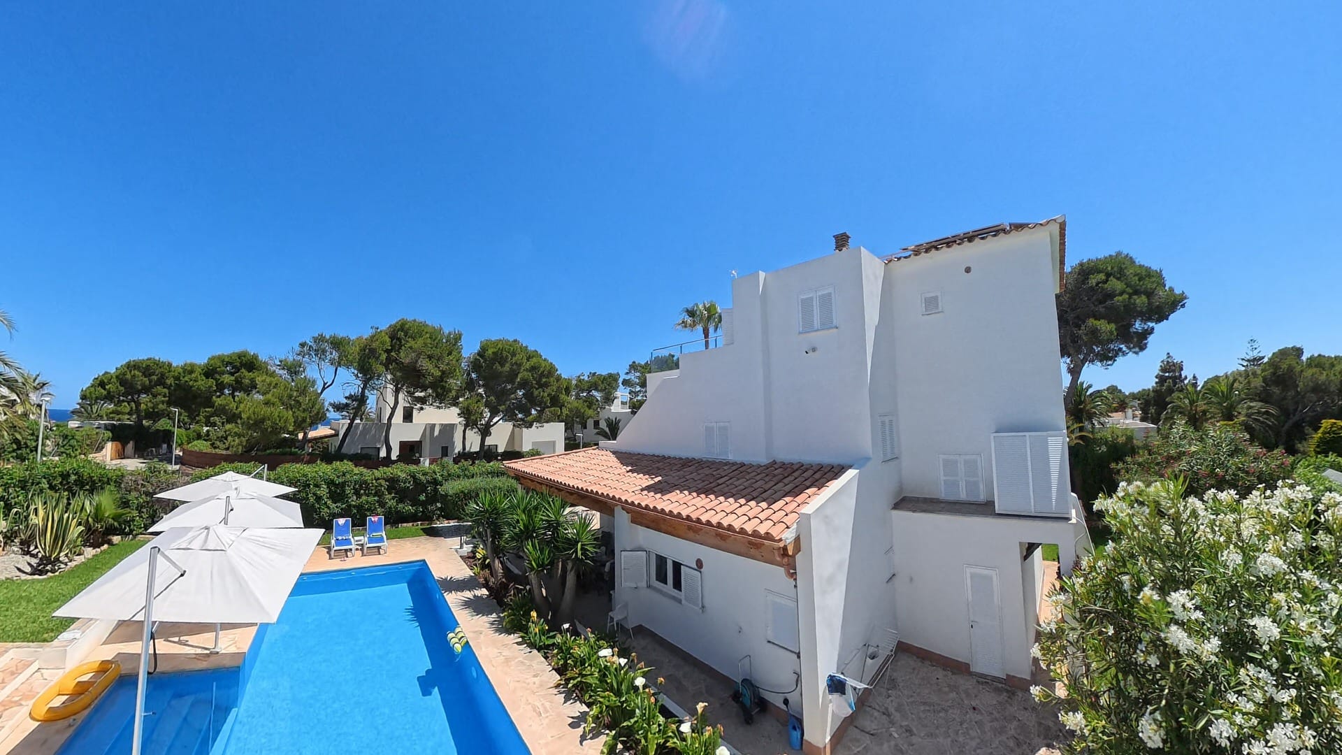 La piscina de agua salada de 12 metros de largo con ducha exterior invita a darse un chapuzón, mientras que el sistema de riego automático facilita el mantenimiento del jardín. Un sistema de alarma, cámaras y conexiones a Internet y TV vía satélite completan el paquete de seguridad y tecnología.