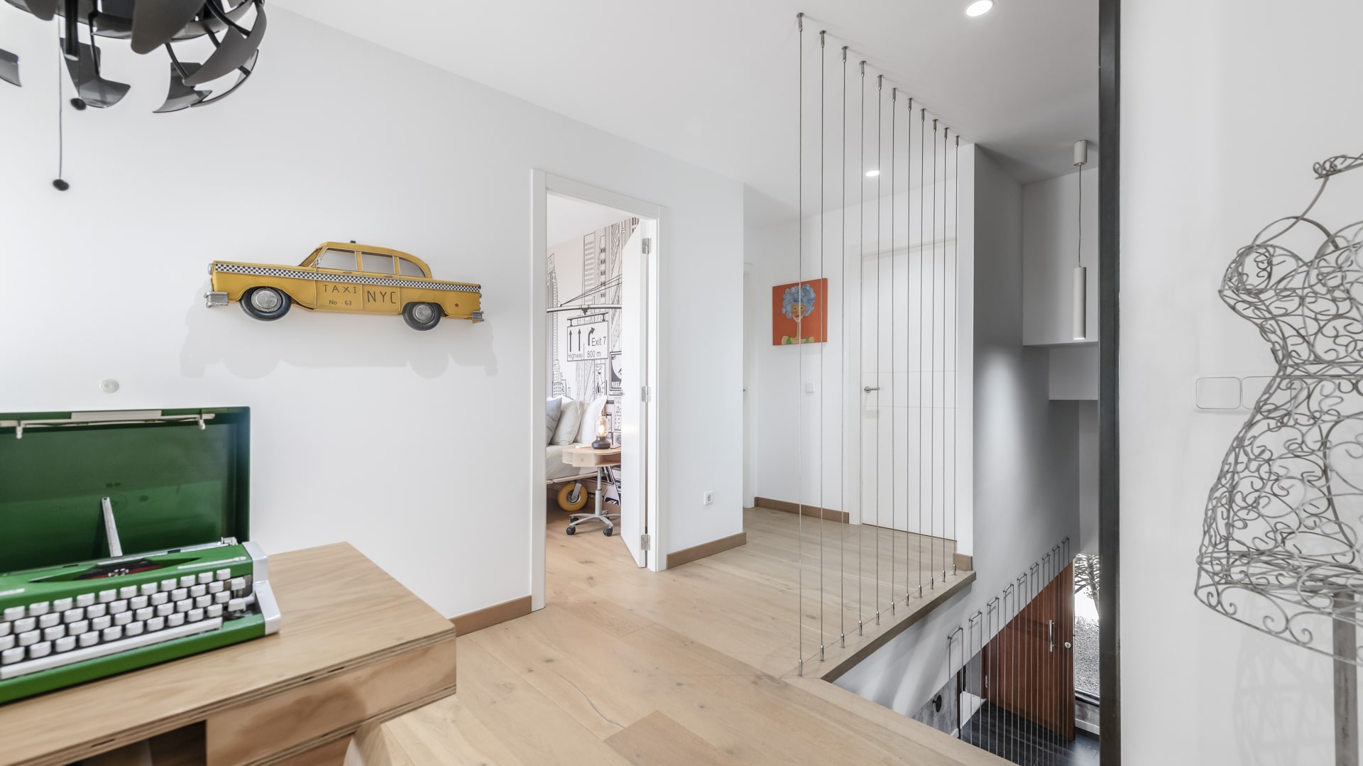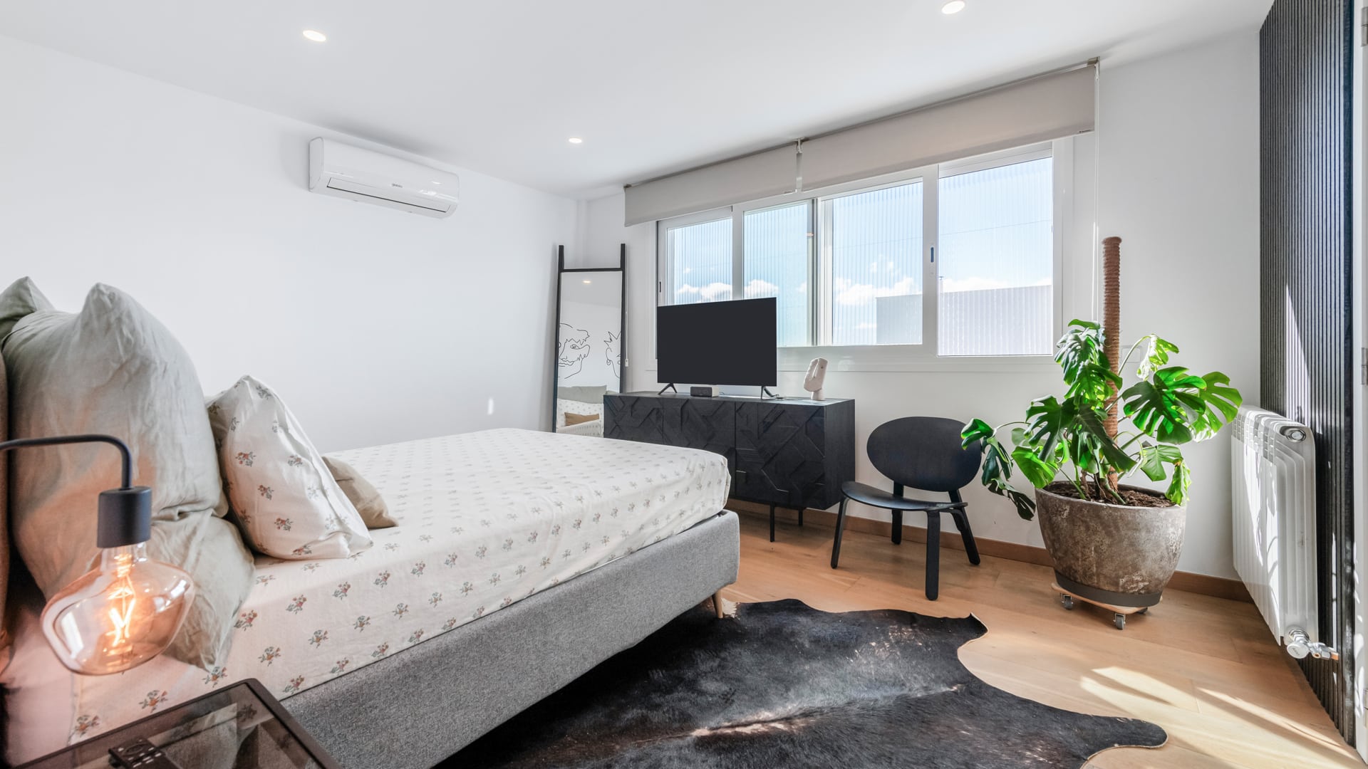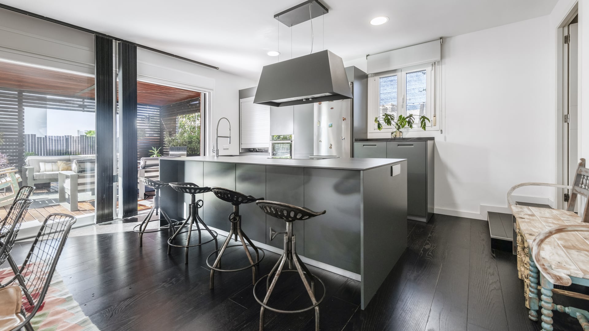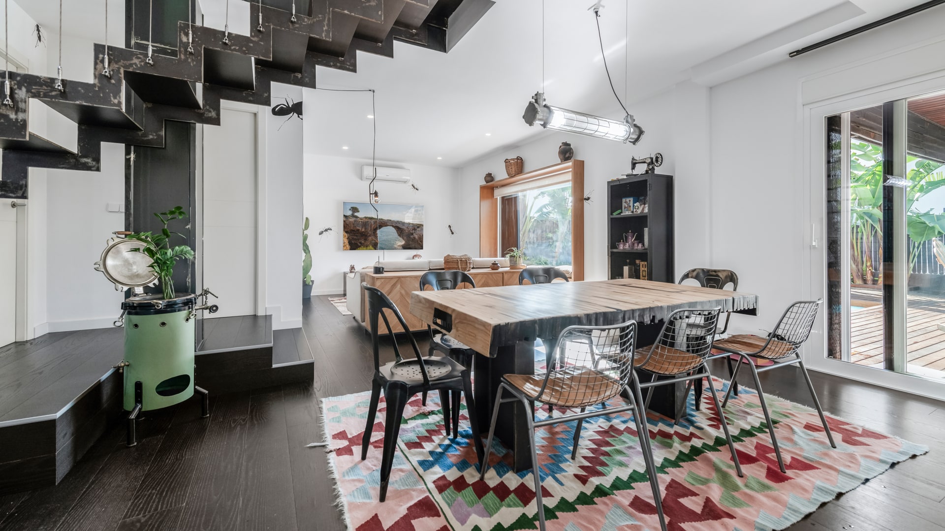 La vivienda combina un estilo industrial cálido, donde la madera natural y el metal negro crean un equilibrio perfecto entre robustez y calidez. Cada espacio refleja la personalidad y el talento del propietario, con muebles y detalles hechos a mano que aportan autenticidad y carácter. Los muebles de madera maciza, las estructuras metálicas a medida y los acabados artesanales destacan en cada rincón: desde estanterías soldadas a mano hasta mesas de comedor diseñadas y fabricadas por el propio dueño. La iluminación, con lámparas de hierro forjado y tonos ámbar, realza la textura de los materiales naturales, creando una atmósfera acogedora y contemporánea. La casa está equipada con electrodomésticos modernos integrados en un entorno rústico–industrial, combinando funcionalidad y estética. Cada elemento ha sido seleccionado o creado con dedicación, haciendo de este hogar un espacio único, auténtico y con alma propia.