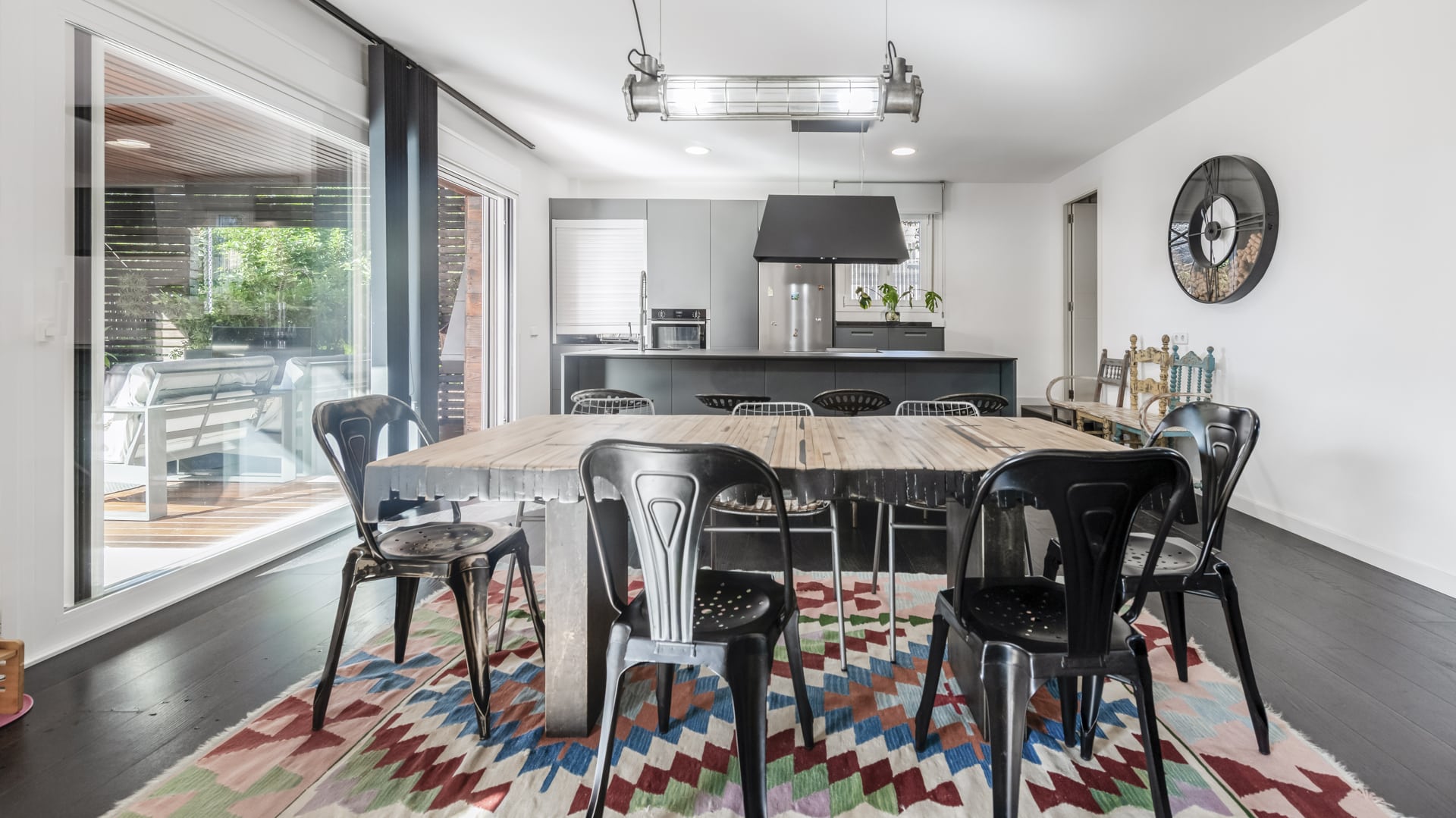 Salón-comedor diáfano con grandes ventanales y salida directa al jardín.