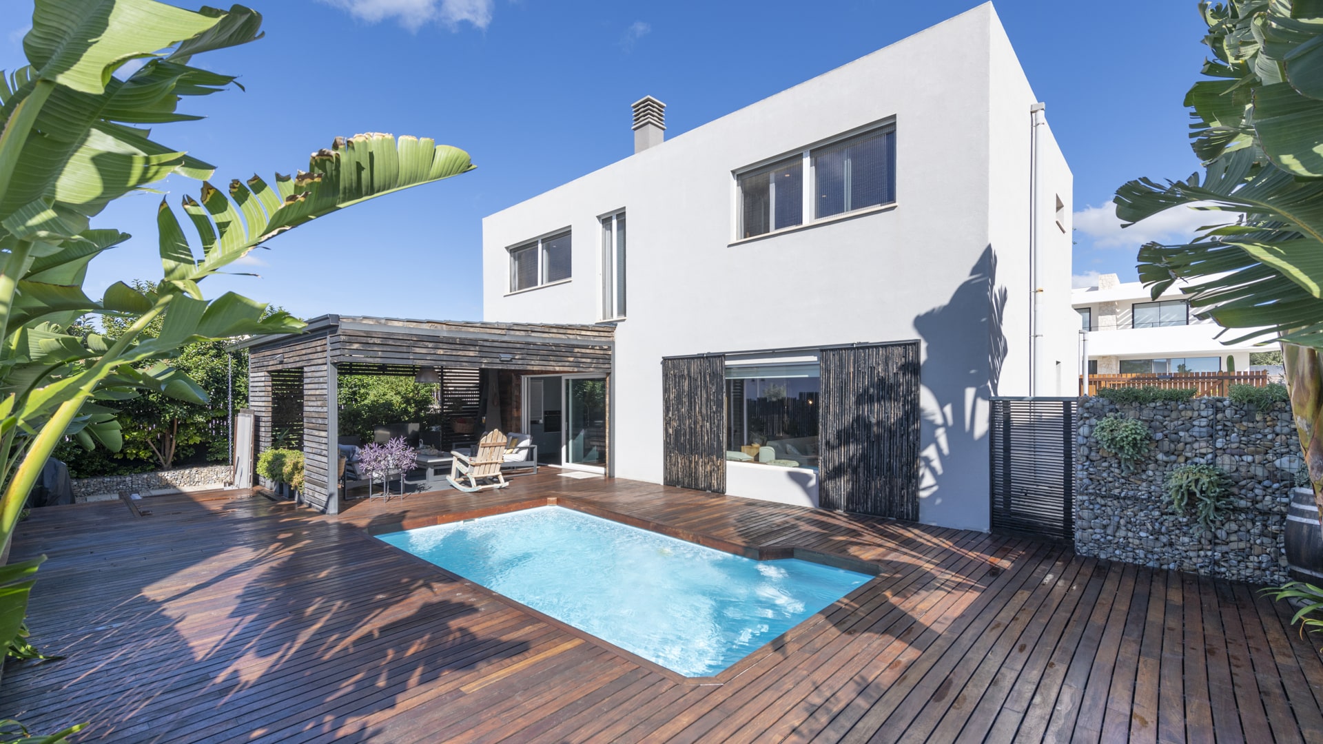 Piscina privada rodeada de zonas de relax y vegetación mediterránea.