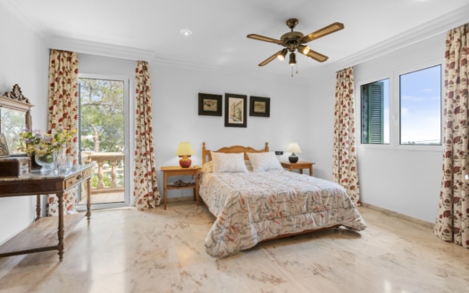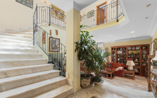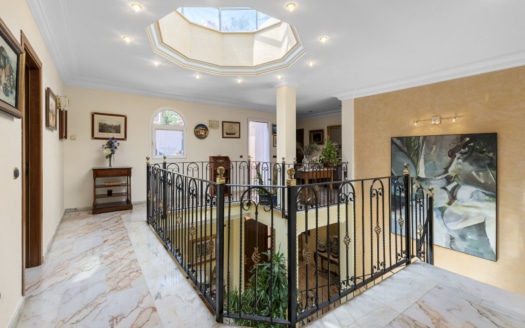 La superficie construida es de aproximadamente 639 m2 y se distribuye en dos niveles de la siguiente manera: en el nivel principal se encuentra la impresionante sala de estar con una gran chimenea y comedor contiguo, una cocina independiente totalmente equipada, un lavadero, un trastero y un aseo de invitados. Desde este nivel se accede a la espaciosa terraza, parcialmente cubierta, con una gran piscina, jardín, zona de barbacoa y comedor exterior. La propiedad tiene un total de 6 dormitorios, todos con baño en-suite. Algunos de estos dormitorios tienen su propio balcón con maravillosas vistas. Una elegante escalera conduce a la planta superior, donde se encuentran los dormitorios. También hay un vestidor y un despacho que podría convertirse en otro dormitorio. La villa también ofrece un garaje doble, una cochera para 2 vehículos y otra plaza de aparcamiento.
