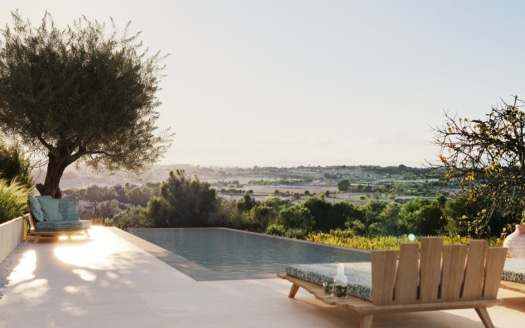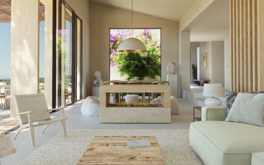 Das Projekt beinhaltet den Bau einer Finca mit einer Wohnfläche von ca. 243 m² auf einer Ebene. Ein offener Wohn-Essbereich mit angrenzender offener Küche und Zugang zur Terrasse mit Pool Terrasse, bildet den Mittelpunkt des täglichen Lebens. Insgesamt sind 3 Schlafzimmer, jeweils mit Bad en suite und Zugang zur Terrasse geplant. Eins davon ist das großzügige Hauptschlafzimmer mit freistehender Badewanne und begehbarem Kleiderschrank. Eine Garage ist ebenfalls geplant.