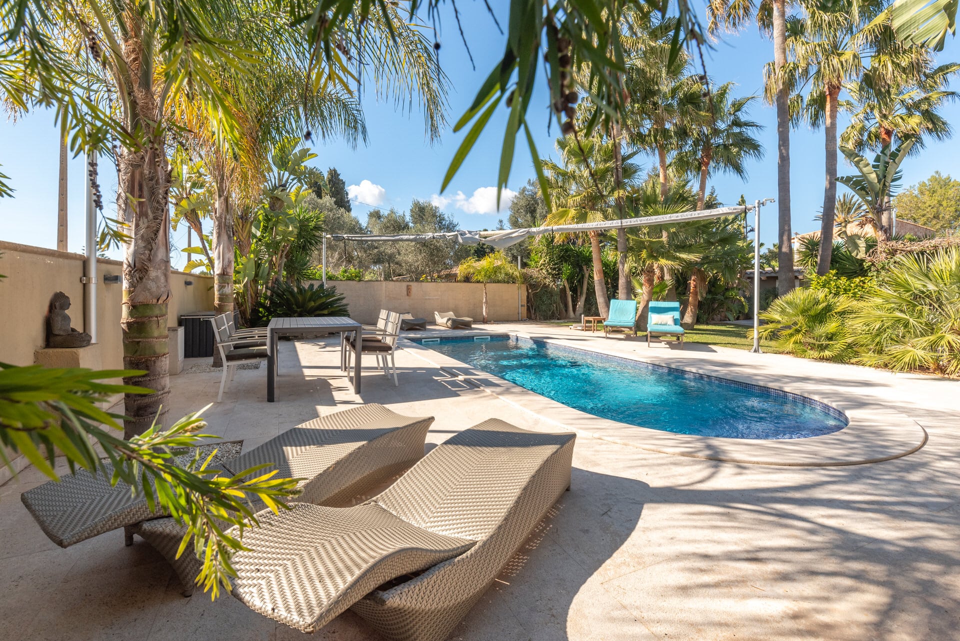 Ein absolutes Highlight des Außenbereichs ist die großzügige Poolterrasse, die von üppiger Vegetation gesäumt wird. Ein robustes und elektrisch zu bedienendes Sonnensegel schützt vor der Sonne.
