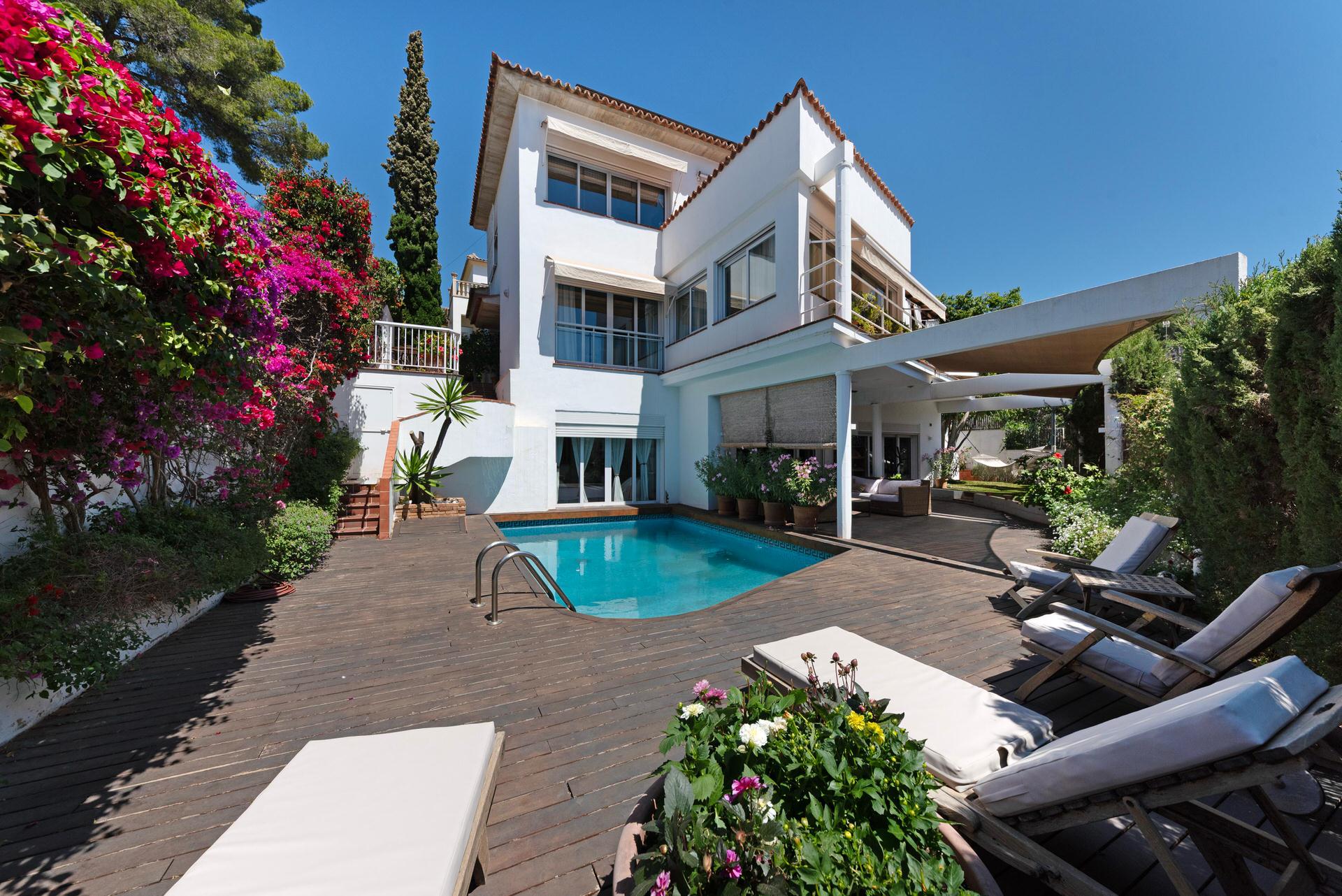 Geräumige dreistöckige Villa plus Garage in San Agustin mit teilweisem Meerblick, Pool und Garten.