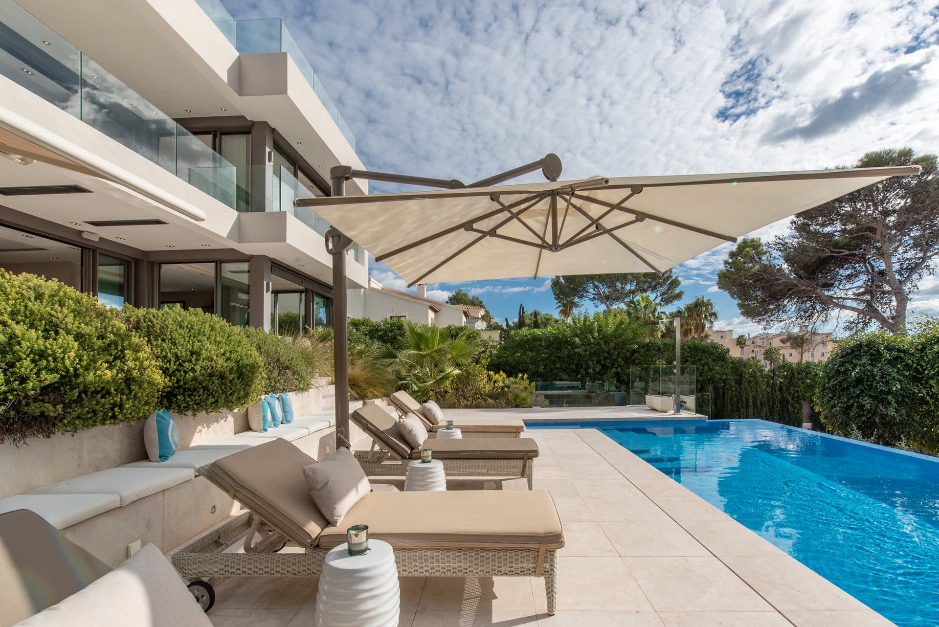 Entspannen Sie auf der überdachten Terrasse mit Lounge und Outdoor-Küche samt BBQ oder am einladenden Pool mit Sonnenterrasse im liebevoll angelegten Garten. Die vier Schlafzimmer mit eigenen Bädern und Terrassenzugang bieten Privatsphäre und Komfort für Familie und Gäste.