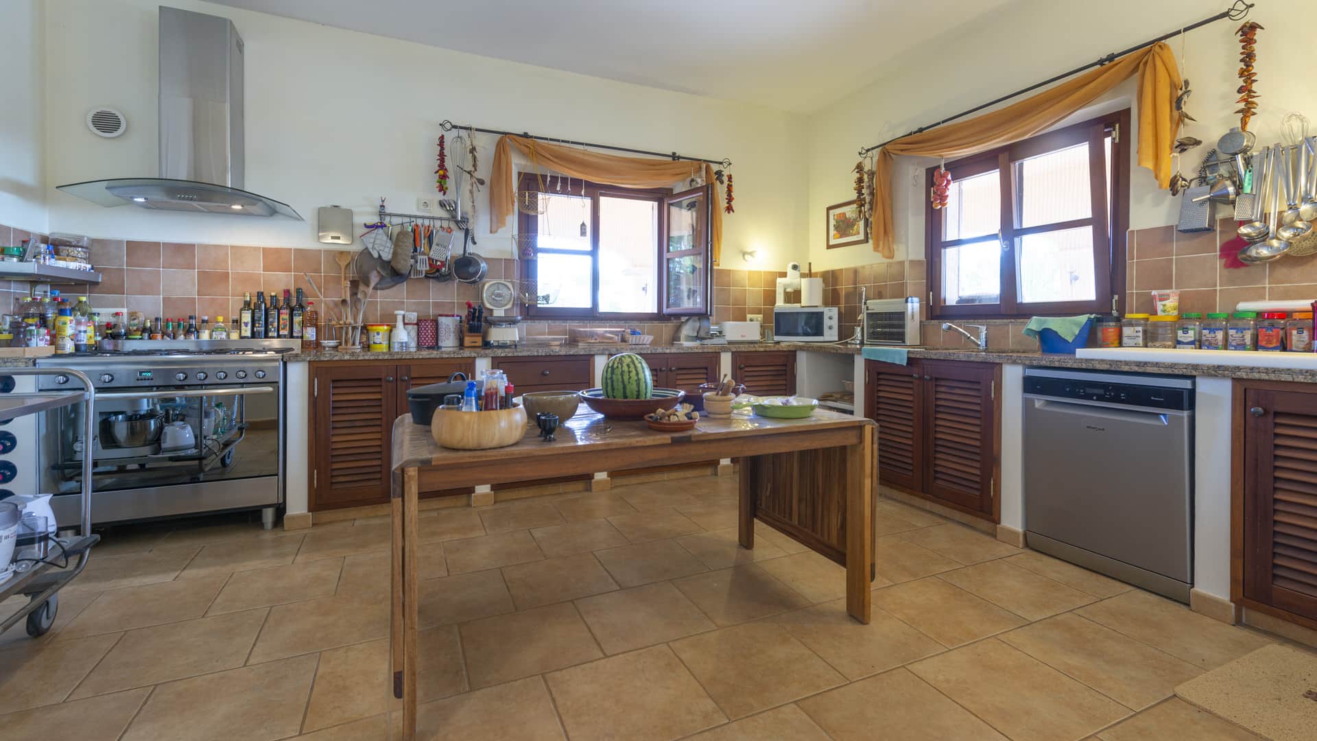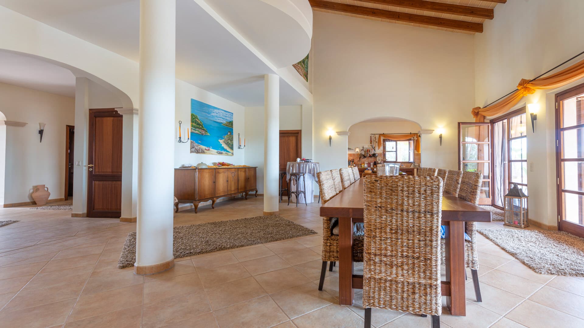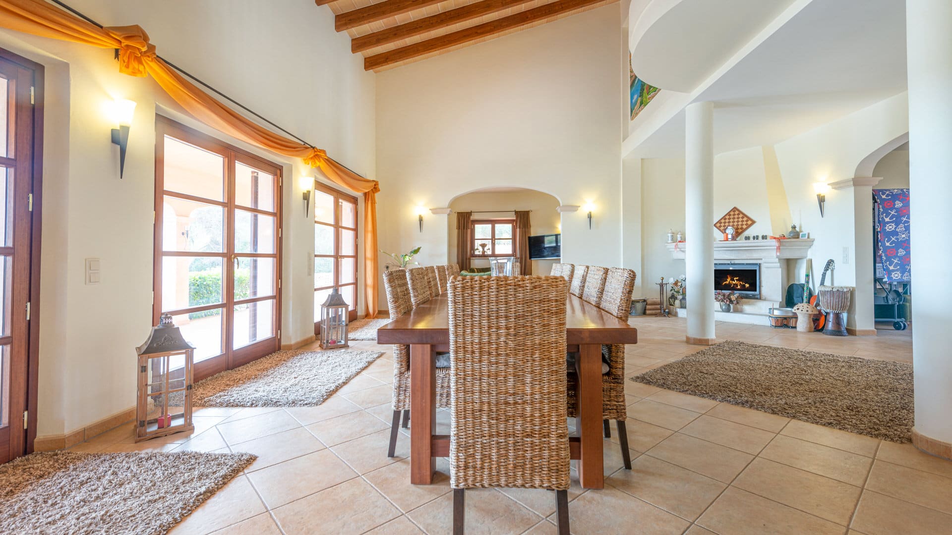 Auf ca. 561 m² Wohnfläche, verteilt auf zwei Ebenen, erwartet Sie ein Zuhause mit mediterranem Flair und großzügiger Raumaufteilung. Der einladende Empfangsbereich führt Sie in den imposanten Essbereich mit Kamin und hohen Decken mit rustikalen Holzbalken. Hier können Sie gesellige Abende mit Familie und Freunden verbringen und die mallorquinische Lebensart genießen. Die offene und voll ausgestattete Küche lässt keine Wünsche offen.
