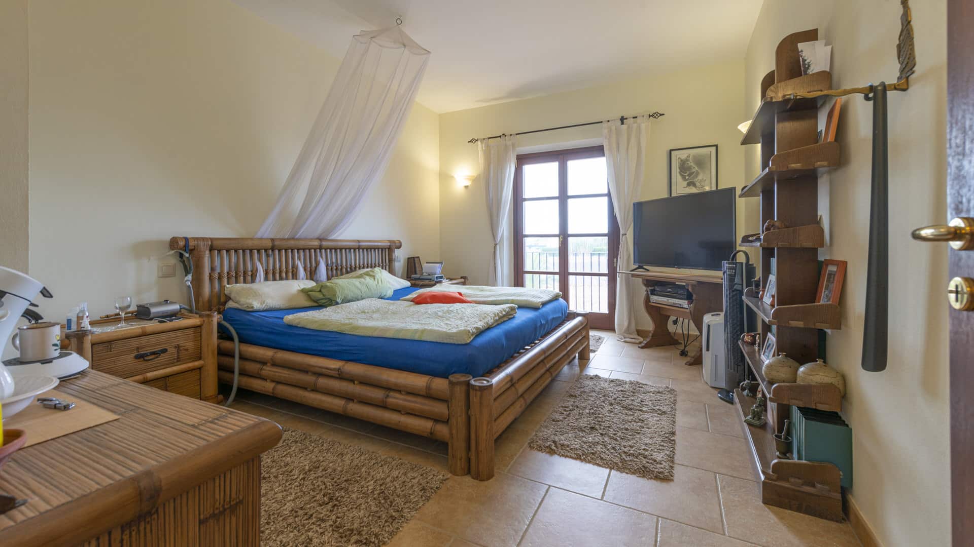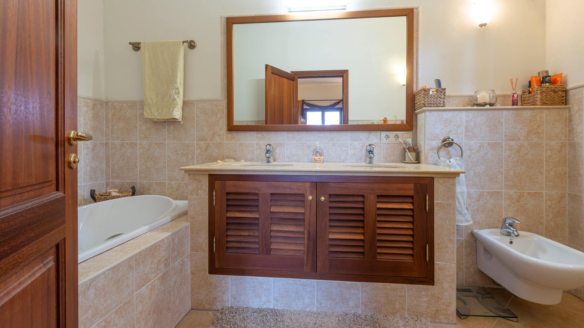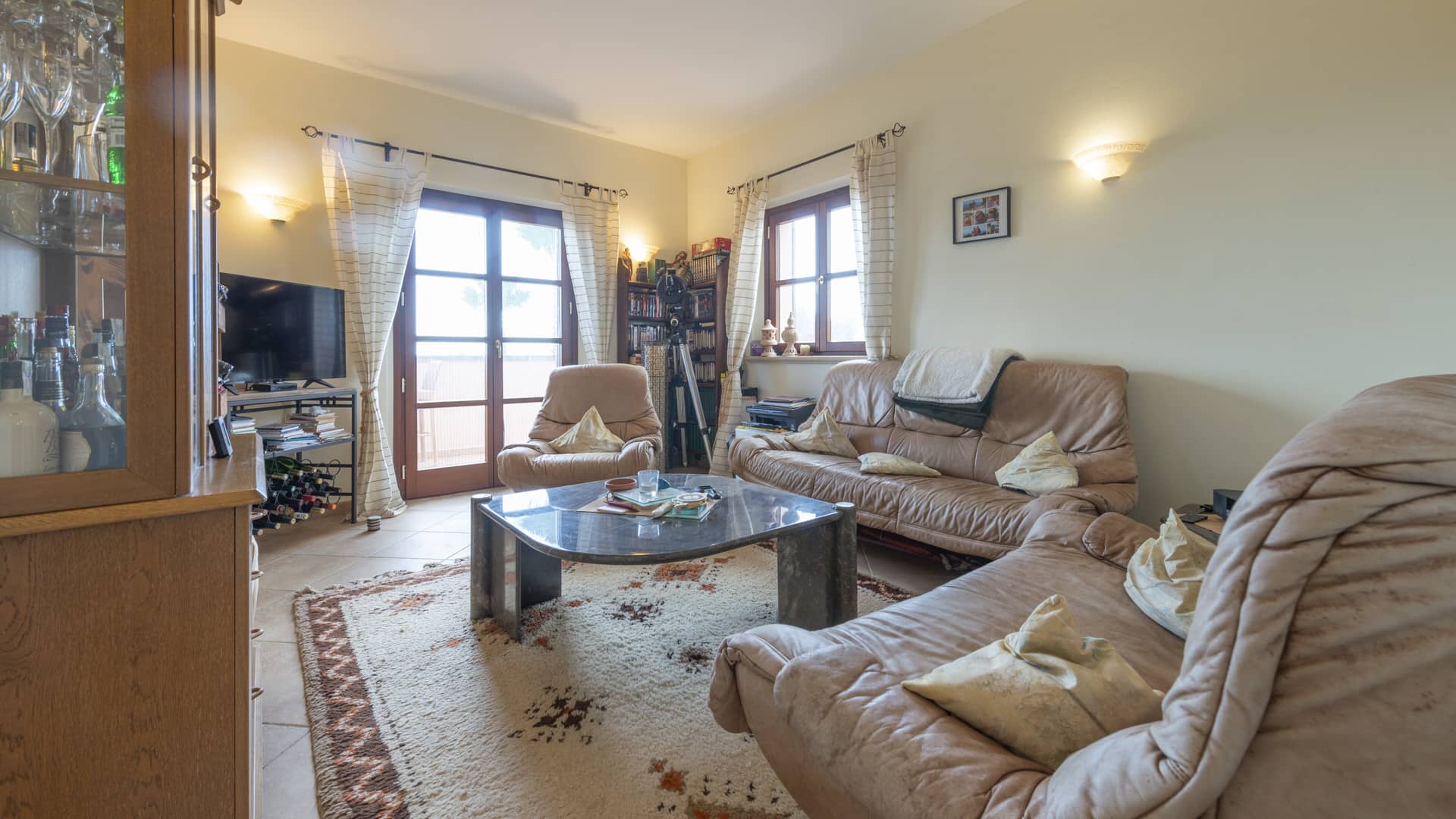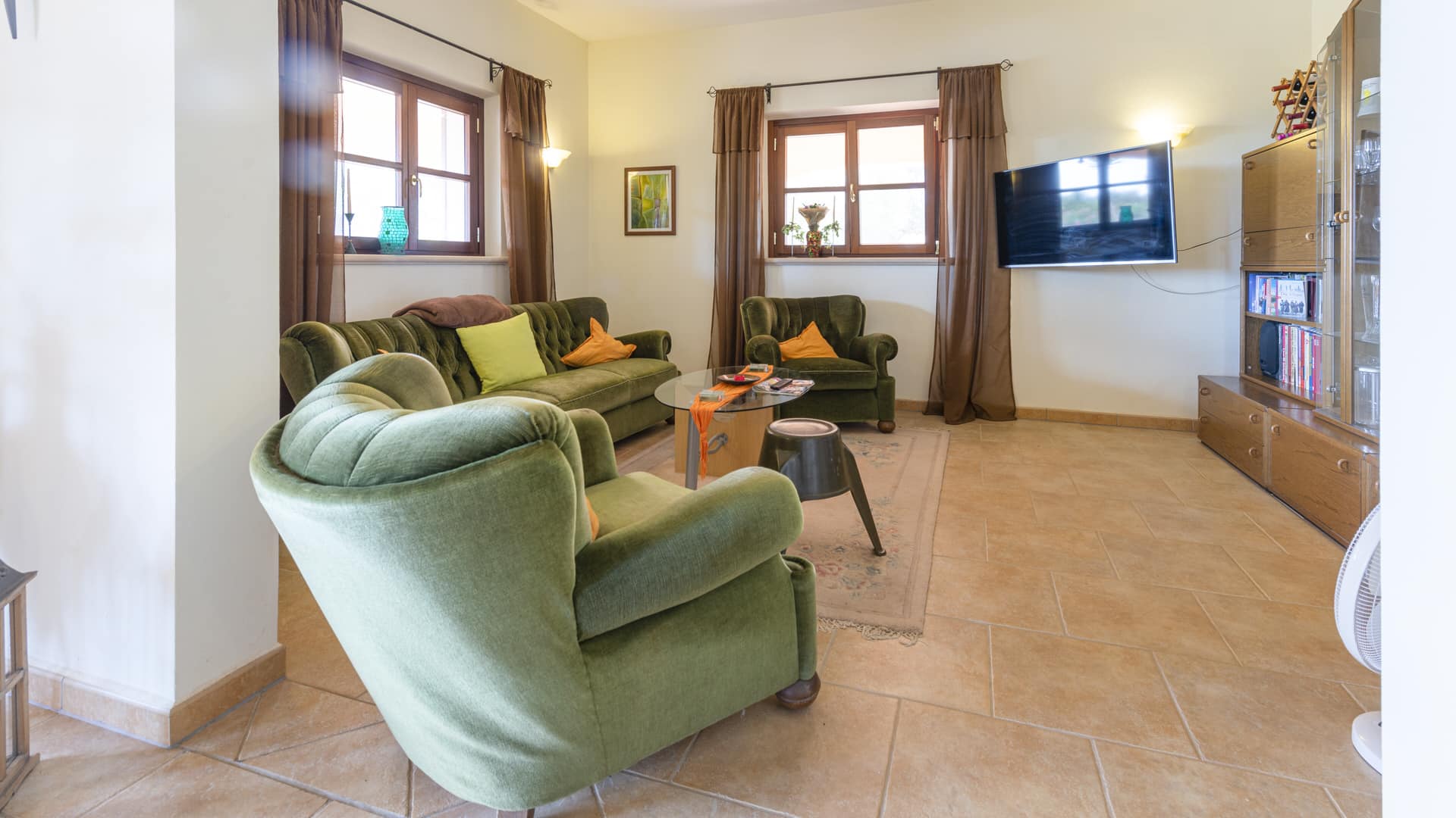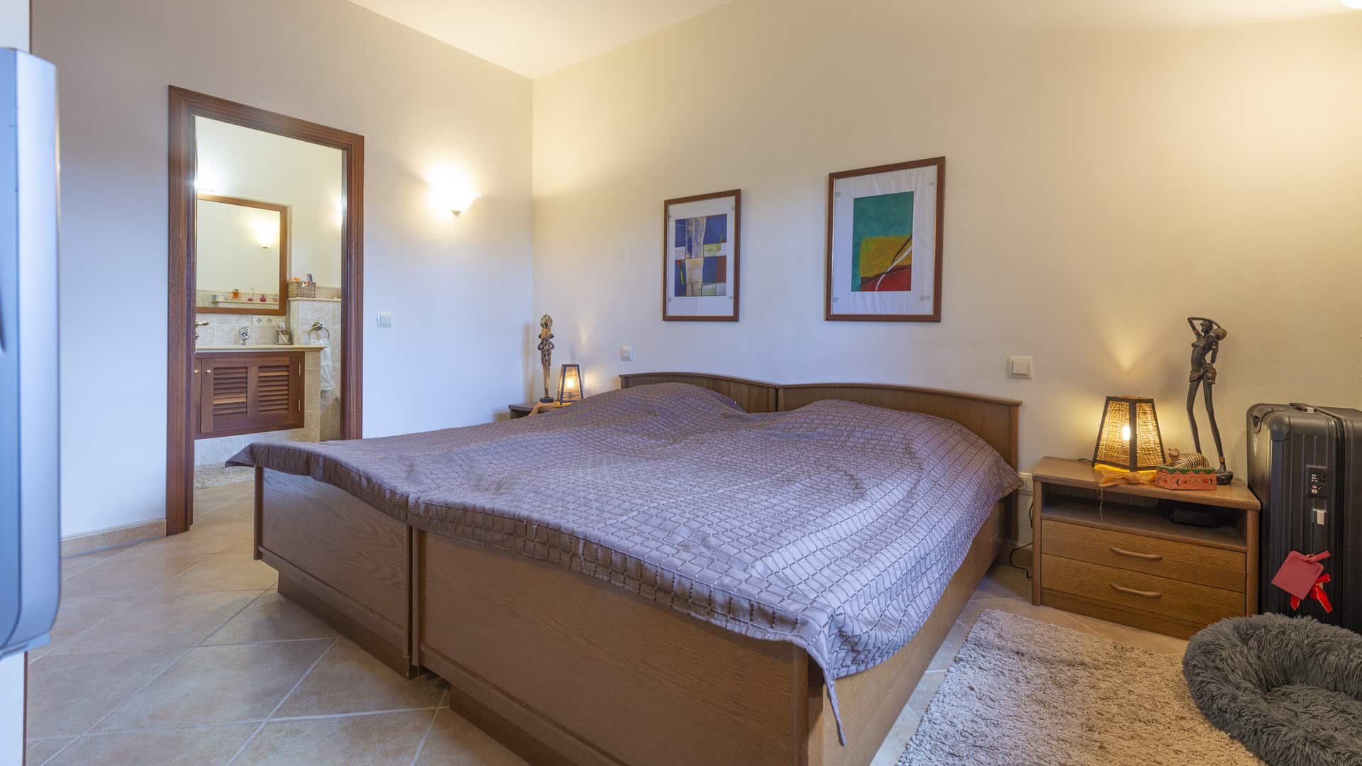 Der angrenzende, gemütliche Wohnbereich öffnet sich auf die teilweise überdachte Terrasse, die zum Verweilen im Freien einlädt. Von hier aus genießen Sie den Blick auf die traumhaft angelegte Poollandschaft, die von einem mediterranen Garten umgeben ist. Auf dieser Ebene befinden sich zudem zwei komfortable Schlafzimmer, zwei Badezimmer und ein praktischer Abstellraum.