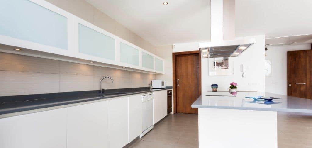 Die moderne Küche ist nahtlos in den Wohnraum integriert und bietet einen perfekten Treffpunkt für Familie und Freunde. Ein architektonisches Highlight ist die elegante Treppe, die stilvoll den Raum gliedert und dem Interieur eine besondere Note verleiht.
