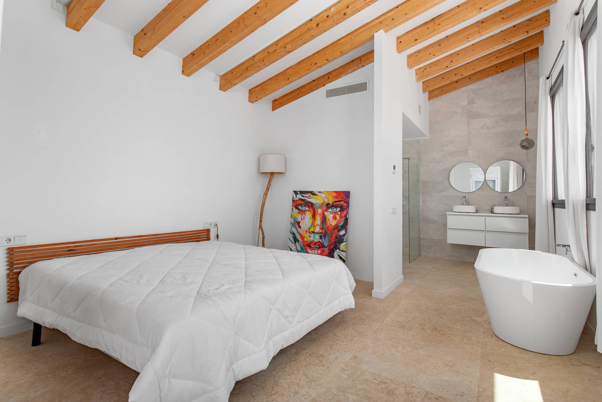 Das gesamte Obergeschoss ist dem Masterbereich gewidmet – ein luxuriöser Rückzugsort mit eigenem Bad samt freistehender Badewanne und Zugang zu einer privaten Terrasse mit traumhaftem Ausblick. Ein Ort, der Ruhe schenkt und den Tag mit einem sanften Sonnenaufgang beginnen lässt.